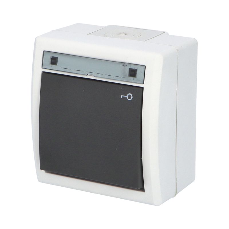 ATLAS 2K 19079-09 IP55 Tlačítko symbol "světlo" č.1/0, na povrch, antracitové RAL 7016. Rozteč kotvících bodů (výška x šířka ): 61x49mm.