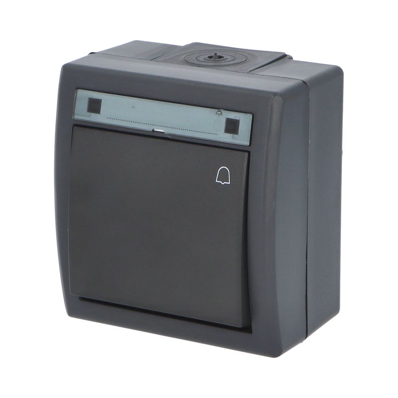 ATLAS 2K 19077-07 IP55 Tlačítko symbol "zvonek" č.1/0, na povrch, šedé. Provedení v šedé barvě RAL 7035 a ovládacím prvkem v barvě RAL 7016. Rozteč kotvících bodů (výška x šířka ): 61x49mm.