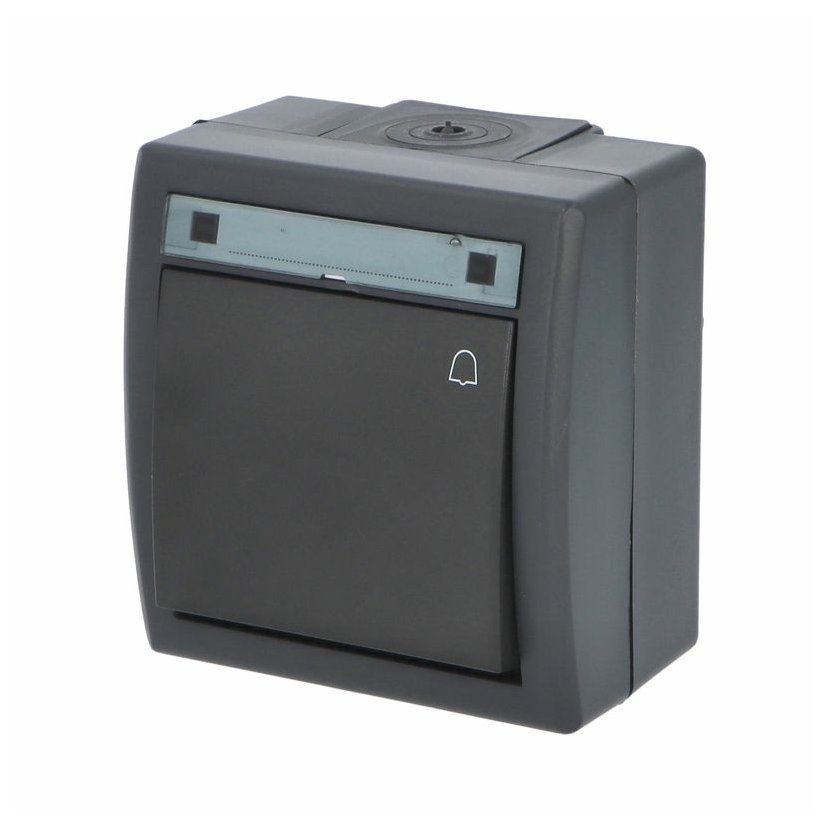 ATLAS 19077 IP55 Tlačítko symbol "zvonek" č.1/0, na povrch, šedé. Provedení v šedé barvě RAL 7035 a ovládacím prvkem v barvě RAL 7043. Rozteč kotvících bodů (výška x šířka ): 61x49mm.