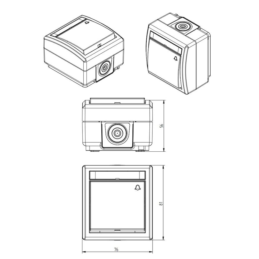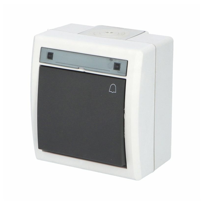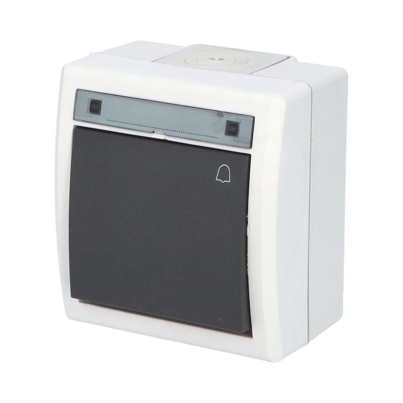 ATLAS 19077 IP55 Tlačítko symbol "zvonek" č.1/0, na povrch, šedé. Provedení v šedé barvě RAL 7035 a ovládacím prvkem v barvě RAL 7043. Rozteč kotvících bodů (výška x šířka ): 61x49mm.