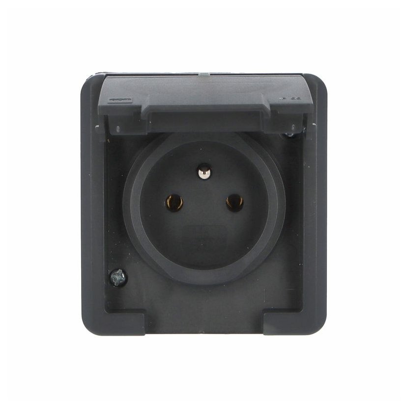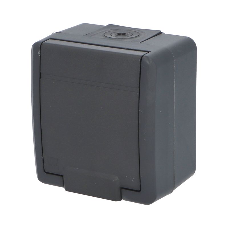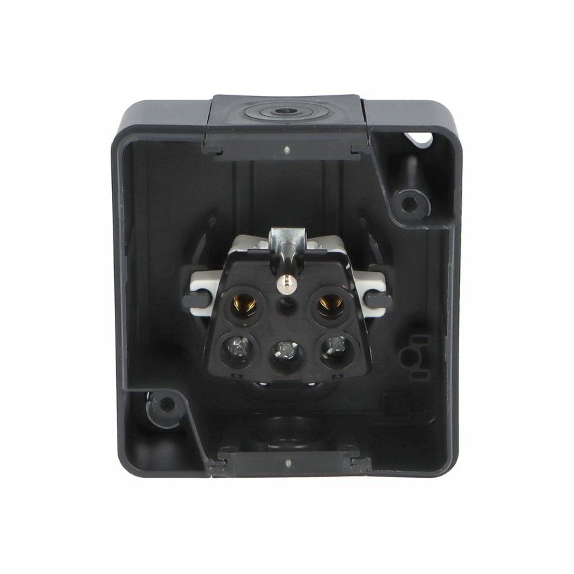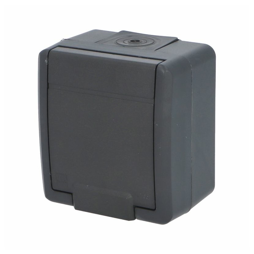 ATLAS 2K 19082-07 IP55 Zásuvka 2P+PE s ochr. kolíkem, na povrch, šedá. Provedení v šedé barvě RAL 7035 a ovládacím prvkem v barvě RAL 7016. Rozteč kotvících bodů (výška x šířka ): 63x59mm.