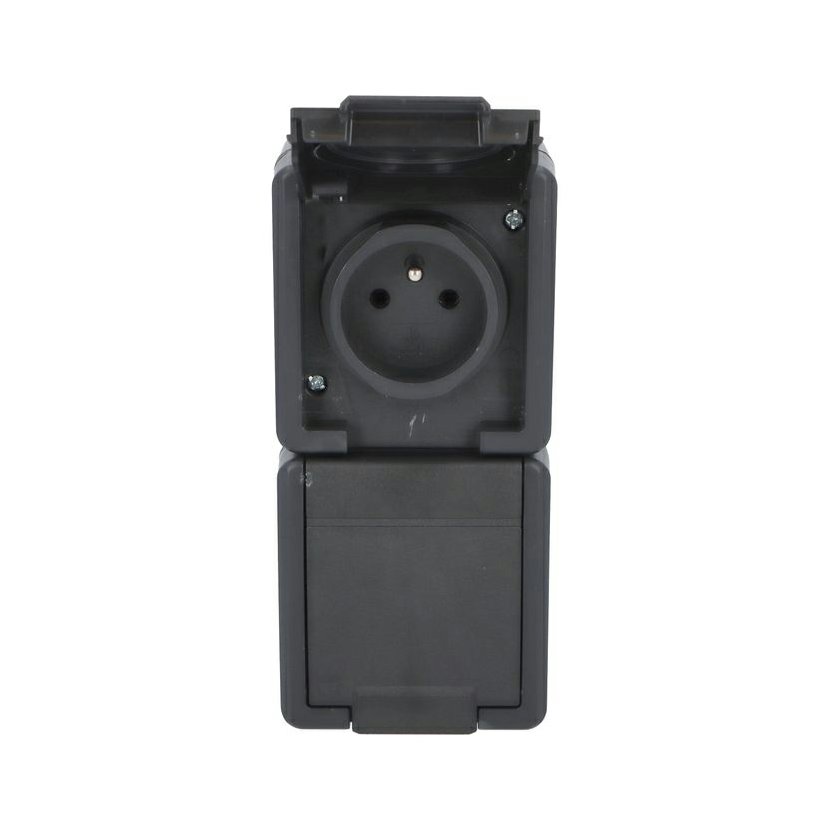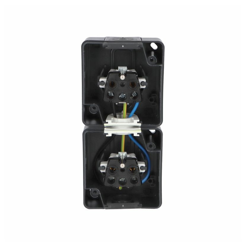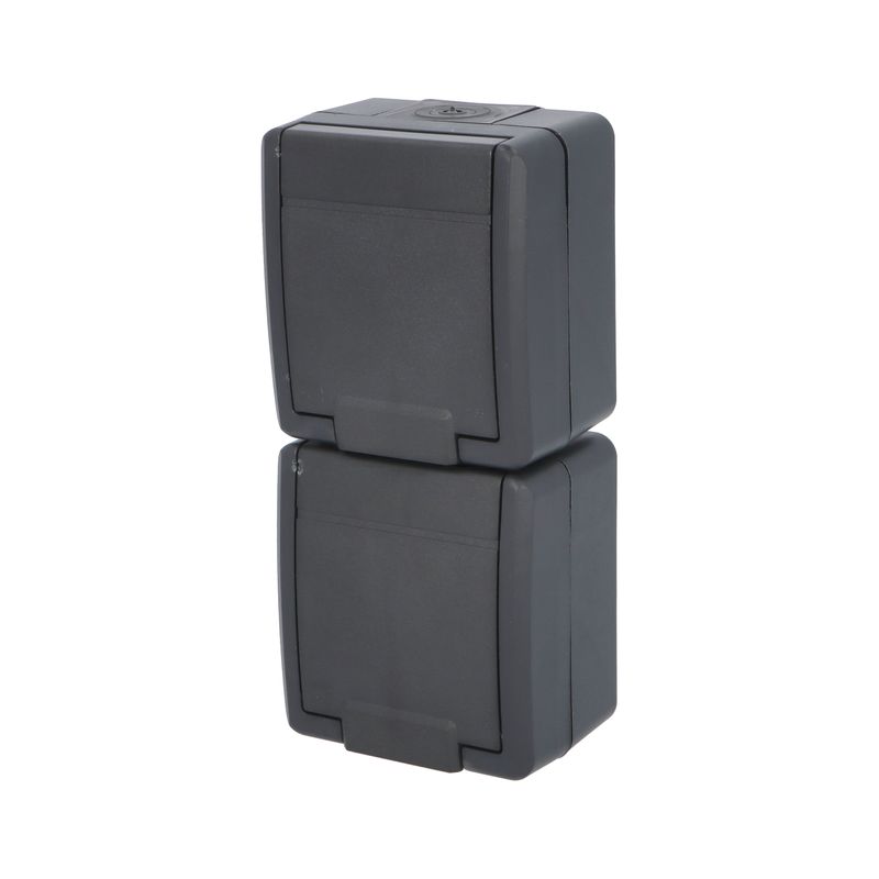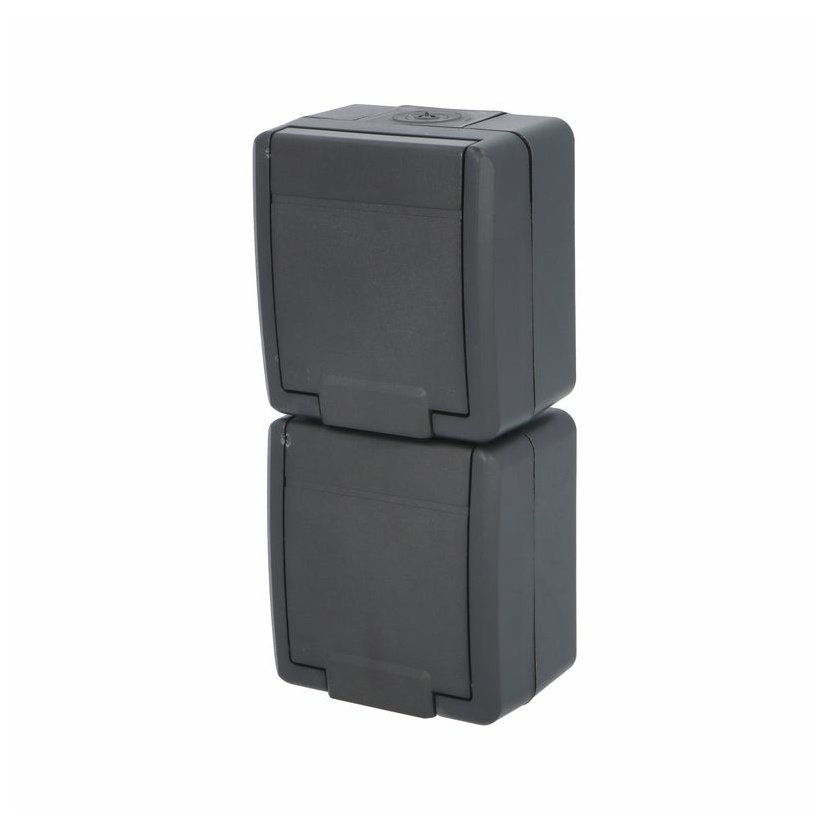 ATLAS 2K 19083-09 IP55 Zásuvka 2x 2P+PE, 2-násobná vodorovná s ochr. kolíkem, na povrch, antracitová RAL 7016. Rozteč kotvících bodů (výška x šířka ): 63x136mm.