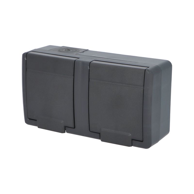 ATLAS 2K 19087-09 IP55 Zásuvka 2x 2P+PE, 2-násobná svislá s ochr. kolíkem, na povrch, antracitová RAL 7016. Rozteč kotvících bodů (výška x šířka ): 146x59mm.