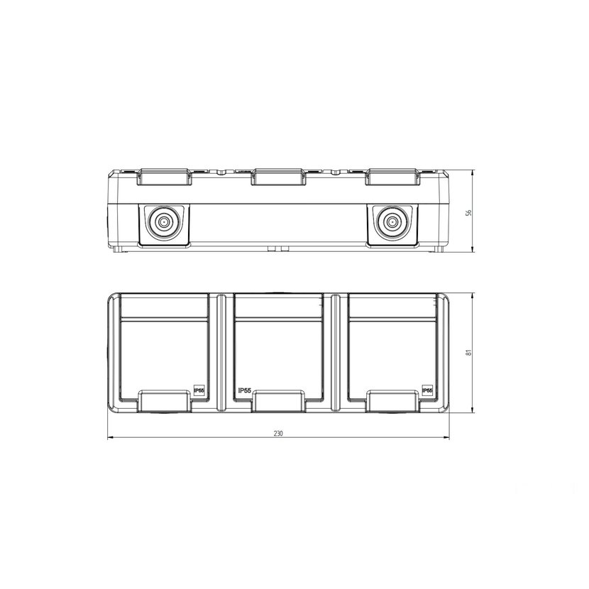 ATLAS 2K 19084-07 IP55 Zásuvka 3x 2P+PE, 3-násobná vodorovná s ochr. kolíkem, na povrch, šedá. Provedení v šedé barvě RAL 7035 a ovládacím prvkem v barvě RAL 7016. Rozteč kotvících bodů (výška x šířka…