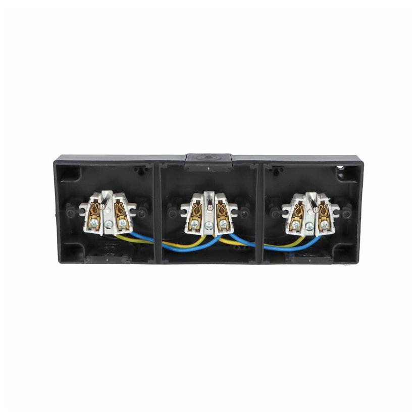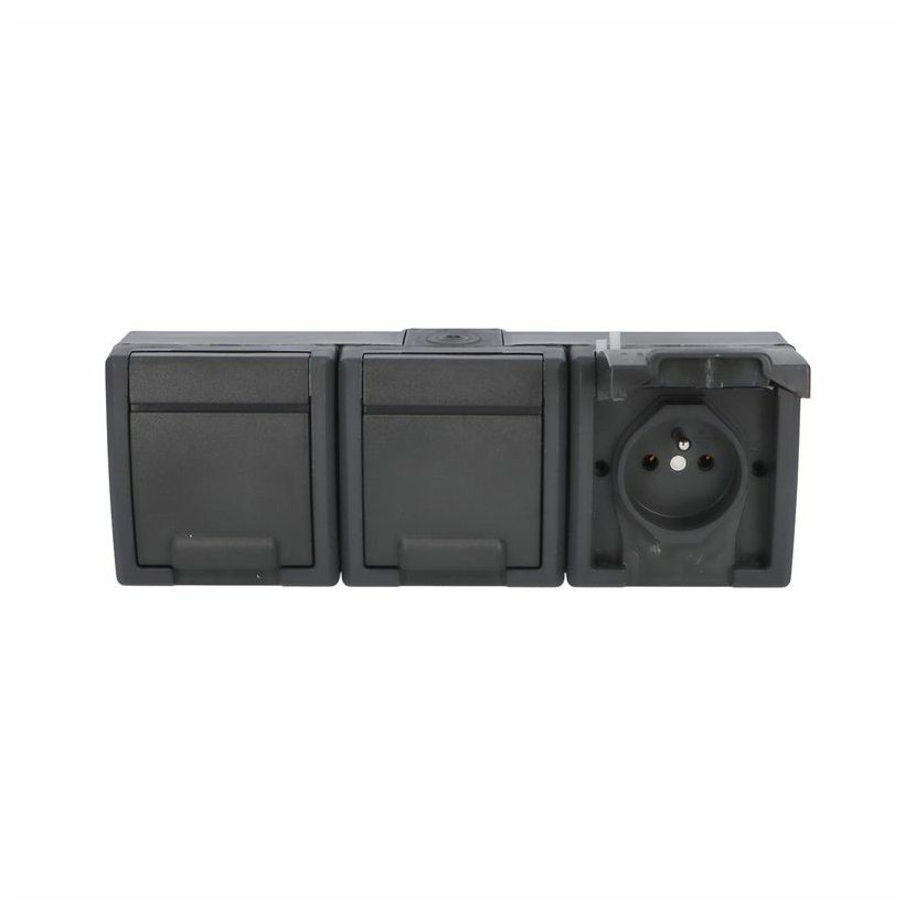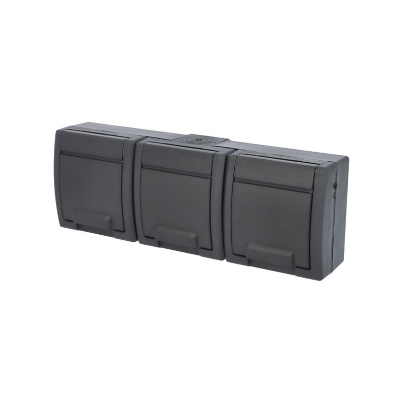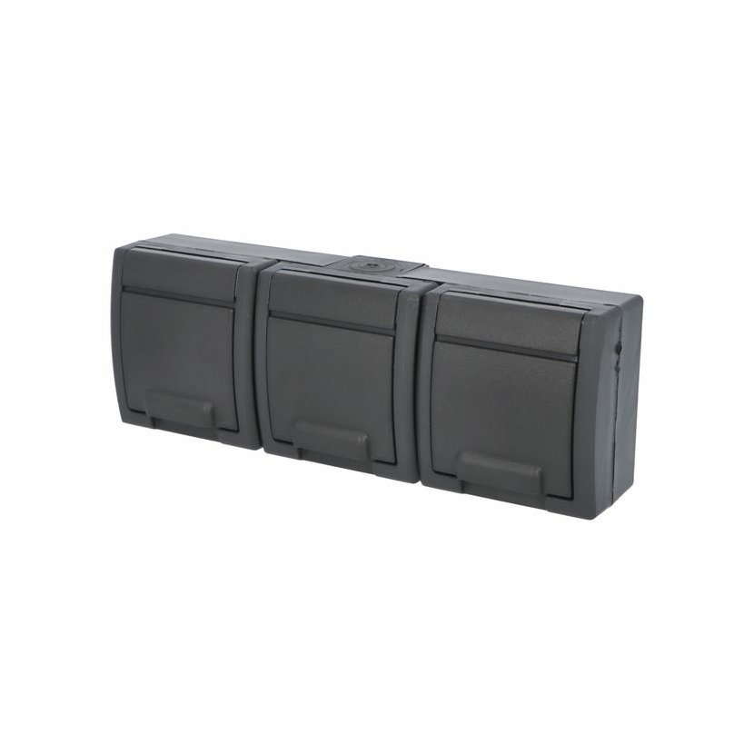ATLAS 2K 19184-09 IP65 Zásuvka 3x 2P+PE, 3-násobná vodorovná s vývodkou M20, na povrch, antracitová RAL 7016. Rozteč kotvících bodů (výška x šířka ): 61x203mm.