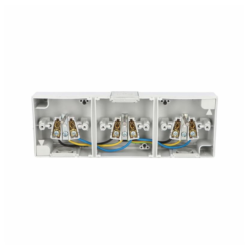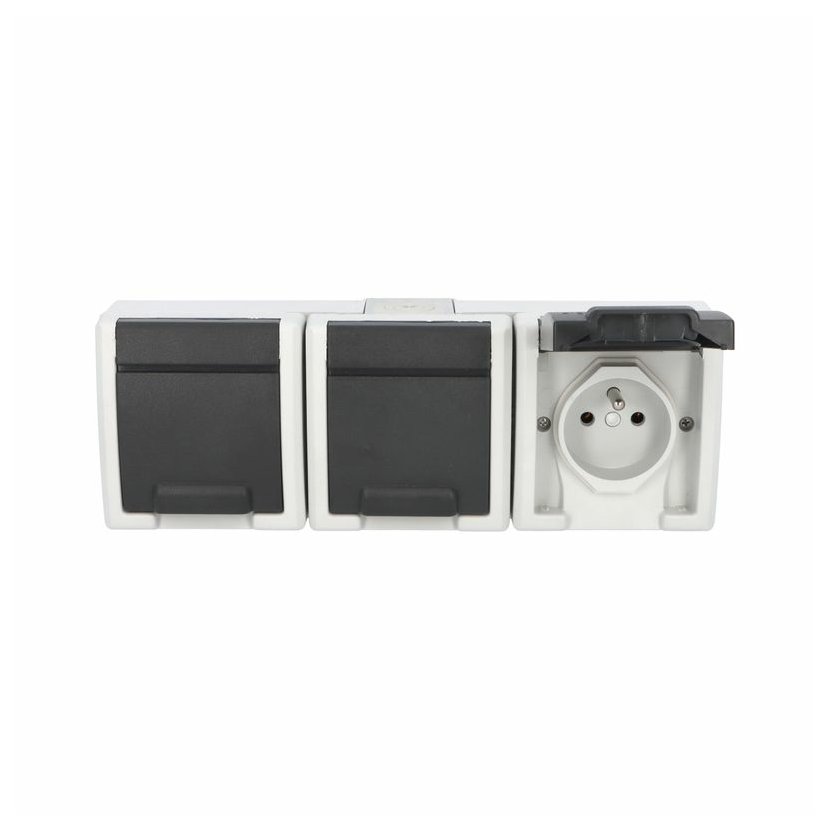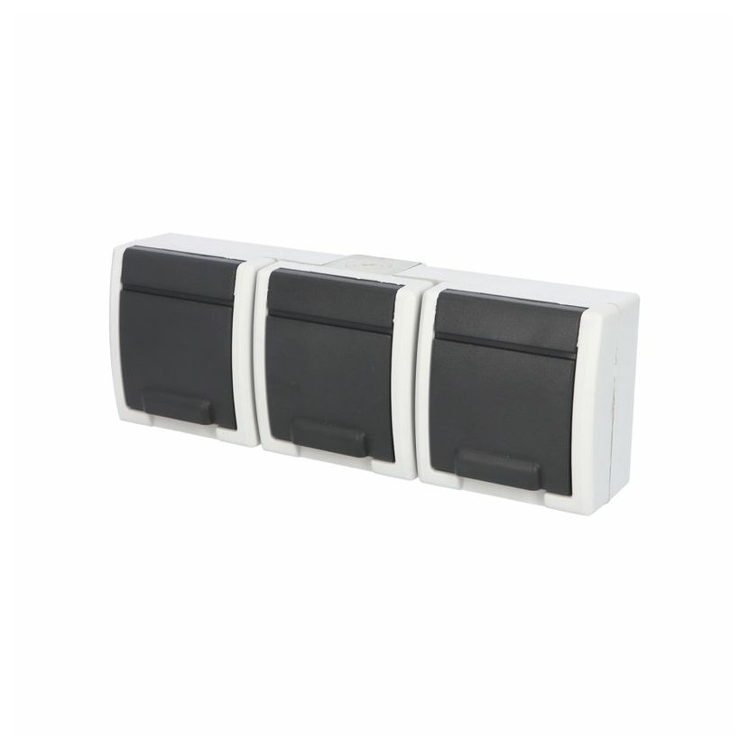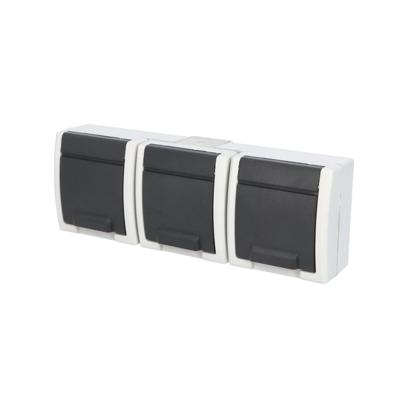 ATLAS 2K 19084-09 IP55 Zásuvka 3x 2P+PE, 3-násobná vodorovná s ochr. kolíkem, na povrch, antracitová RAL 7016. Rozteč kotvících bodů (výška x šířka ): 61x203mm.