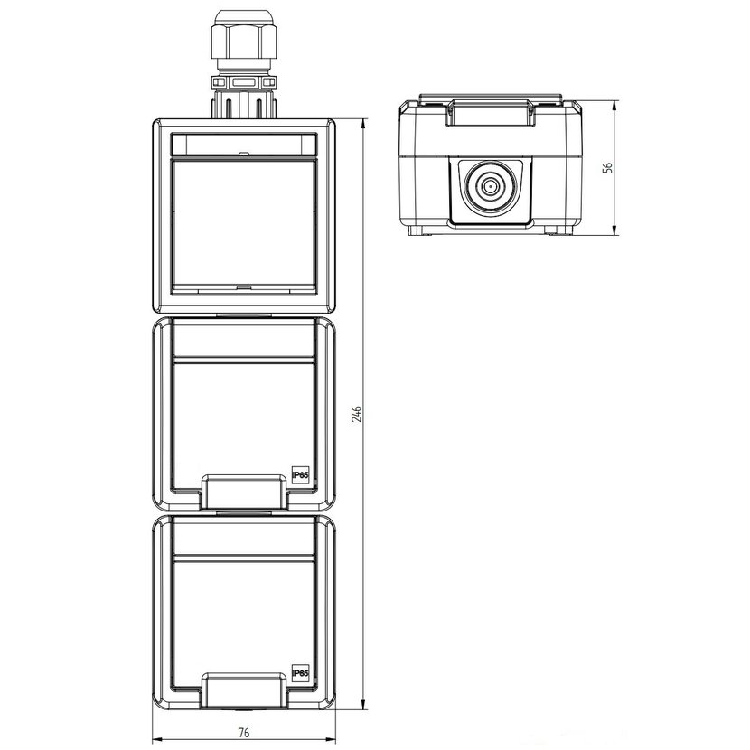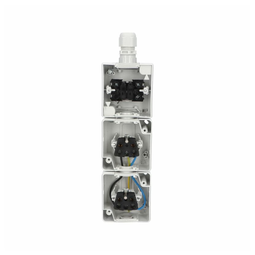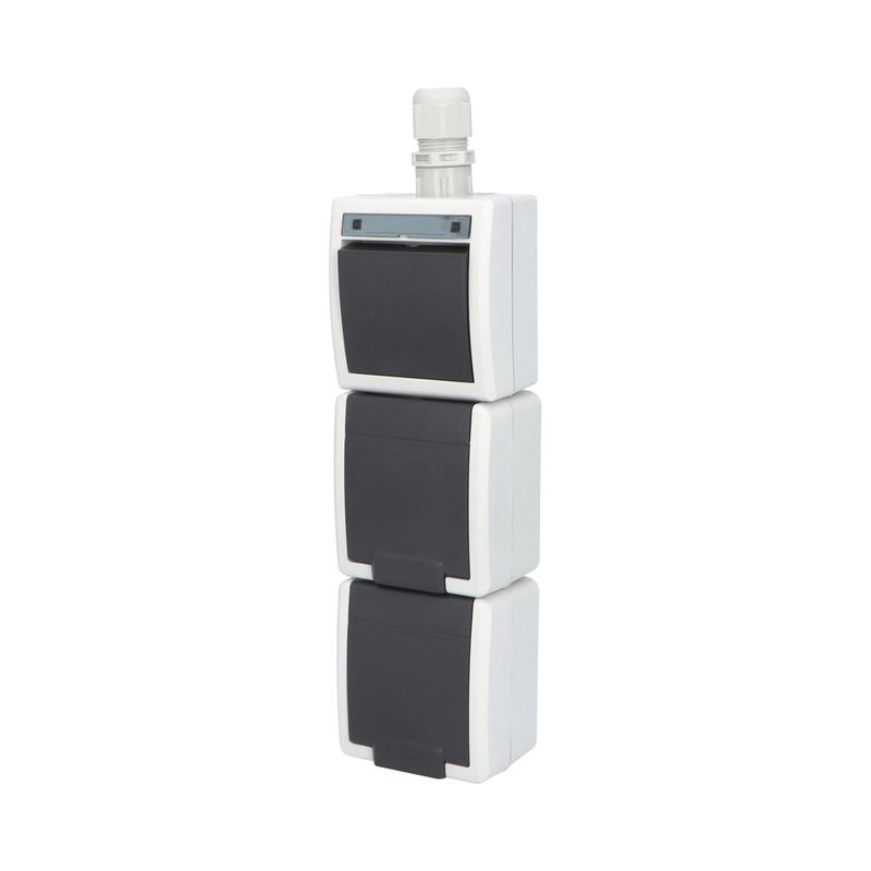 ATLAS 2K 19196-07 IP65 Přepínač č.6 + zásuvka 2x 2P+PE, 2-násobná svisle s ochr. kolíkem, na povrch, šedý. Provedení v šedé barvě RAL 7035 a ovládacím prvkem v barvě RAL 7016. Rozteč kotvících bodů (výška x šířka ): 246x49(59)mm.