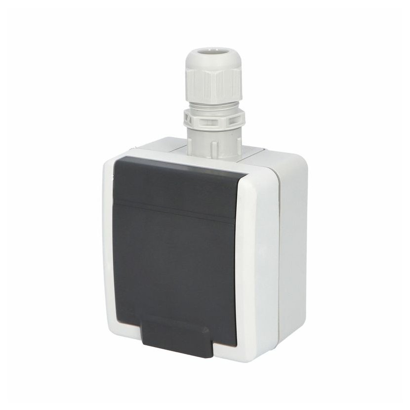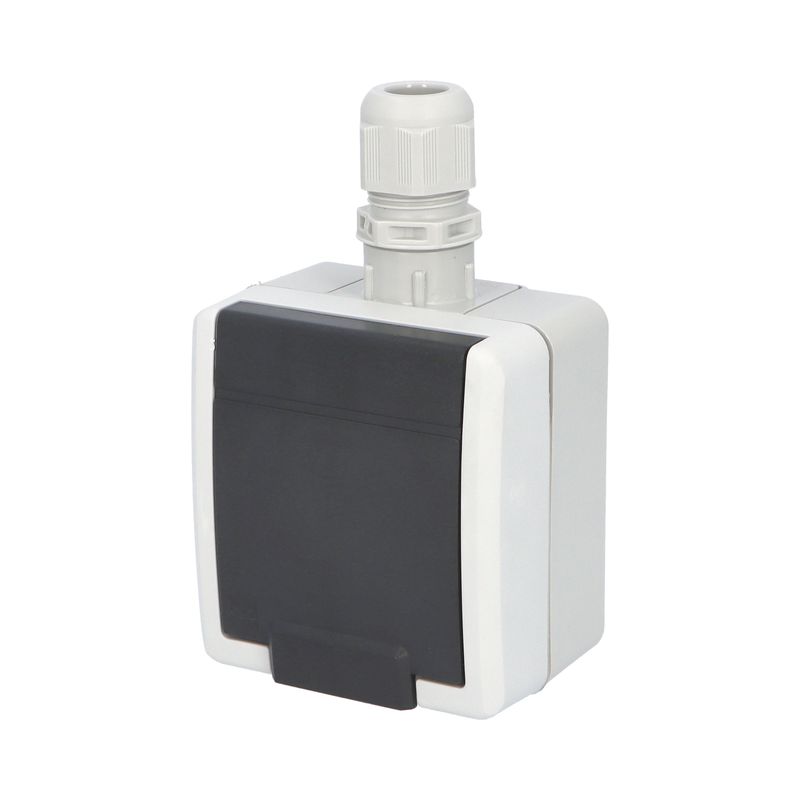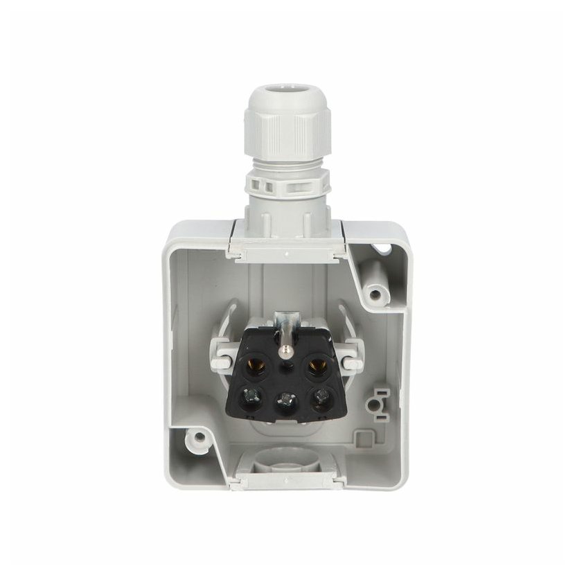 ATLAS 19182 IP65 Zásuvka 2P+PE s vývodkou M20, na povrch, šedá. Provedení v šedé barvě RAL 7035 a ovládacím prvkem v barvě RAL 7043. Rozteč kotvících bodů (výška x šířka ): 63x59mm.