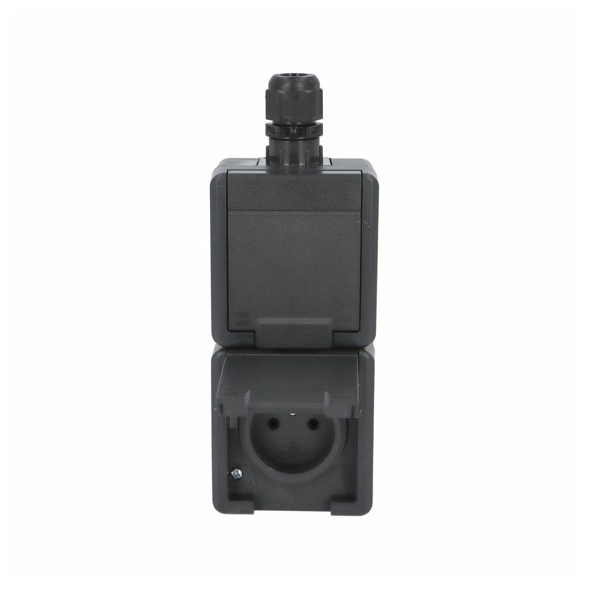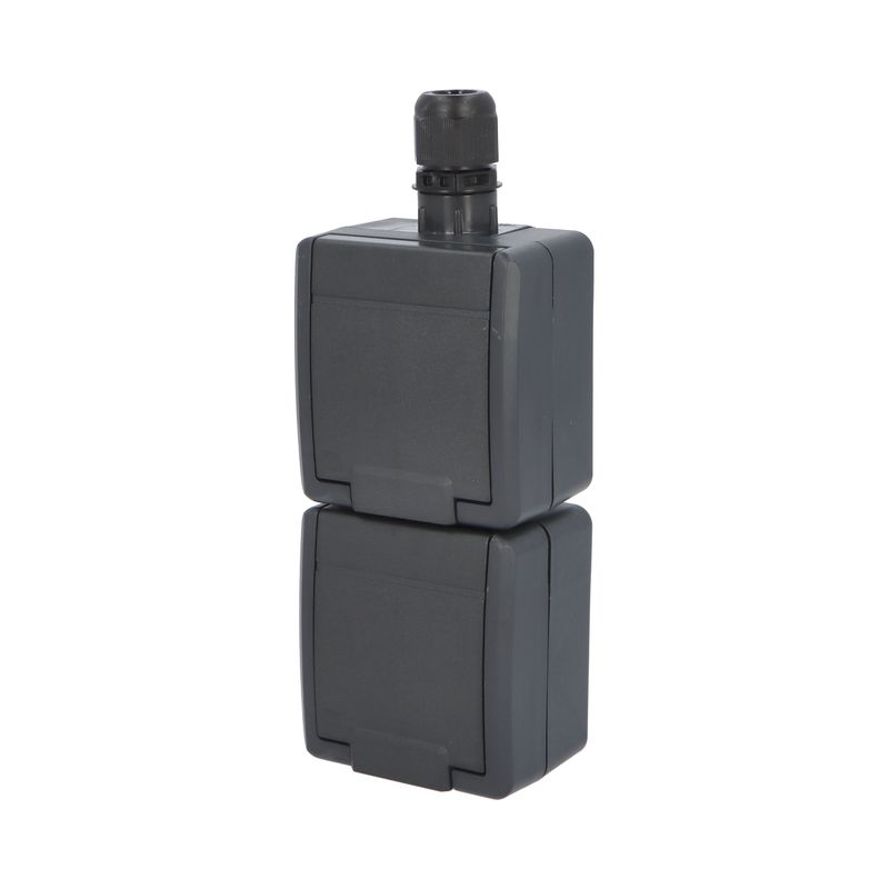 ATLAS 2K 19087-09 IP55 Zásuvka 2x 2P+PE, 2-násobná svislá s ochr. kolíkem, na povrch, antracitová RAL 7016. Rozteč kotvících bodů (výška x šířka ): 146x59mm.
