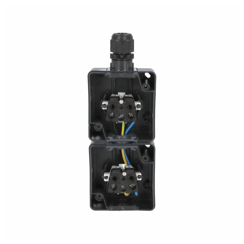 ATLAS 2K 19083-09 IP55 Zásuvka 2x 2P+PE, 2-násobná vodorovná s ochr. kolíkem, na povrch, antracitová RAL 7016. Rozteč kotvících bodů (výška x šířka ): 63x136mm.