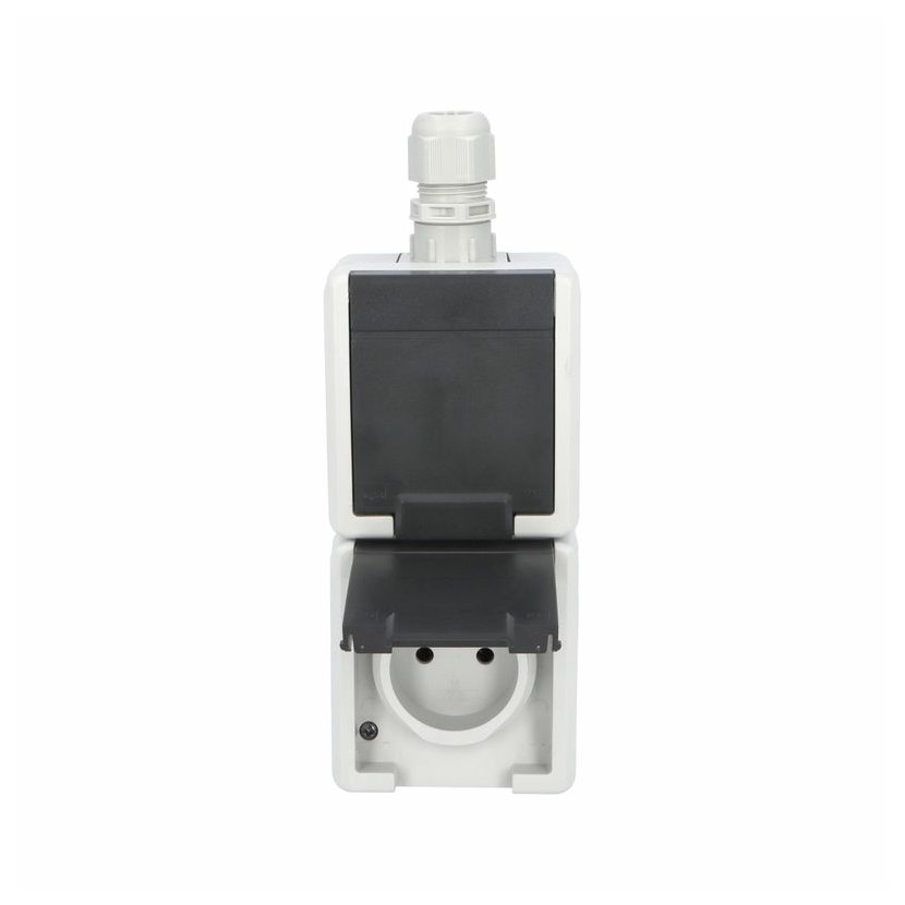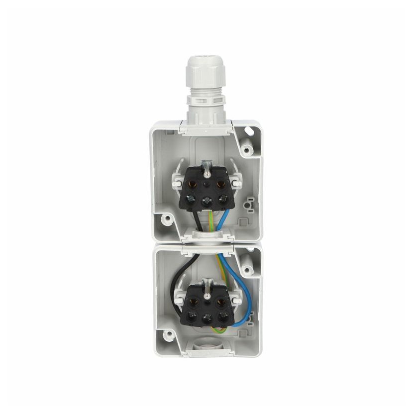 ATLAS 19187 IP65 Zásuvka 2x 2P+PE, 2-násobná svislá s vývodkou M20, na povrch, šedá. Provedení v šedé barvě RAL 7035 a ovládacím prvkem v barvě RAL 7043. Rozteč kotvících bodů (výška x šířka ):…