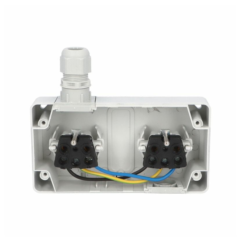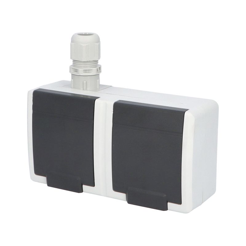 ATLAS 19183 IP65 Zásuvka 2x 2P+PE, 2-násobná vodorovná s vývodkou M20, na povrch, šedá. Provedení v šedé barvě RAL 7035 a ovládacím prvkem v barvě RAL 7043. Rozteč kotvících bodů (výška x šířka ):…