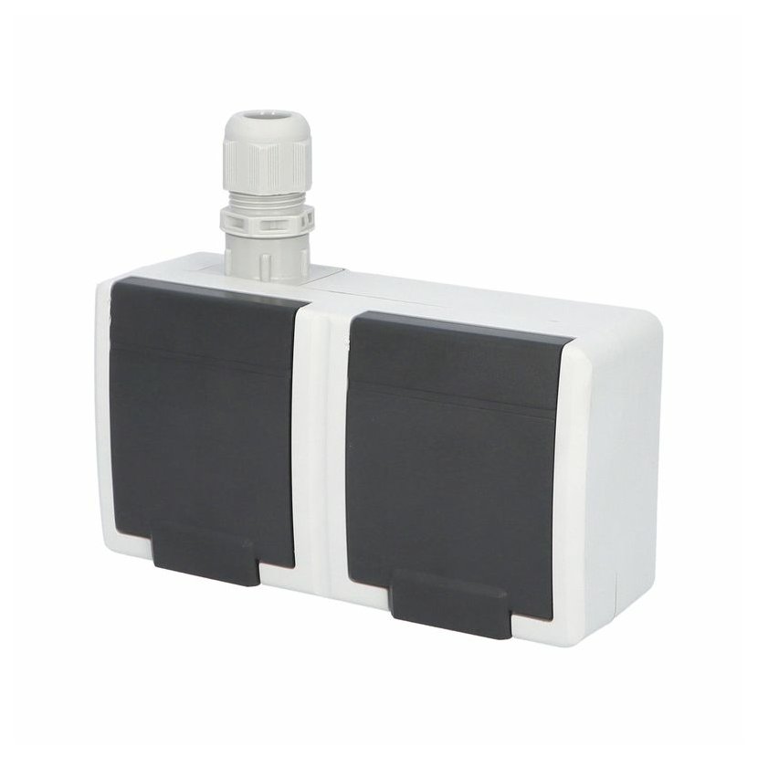 ATLAS 2K 19083-09 IP55 Zásuvka 2x 2P+PE, 2-násobná vodorovná s ochr. kolíkem, na povrch, antracitová RAL 7016. Rozteč kotvících bodů (výška x šířka ): 63x136mm.