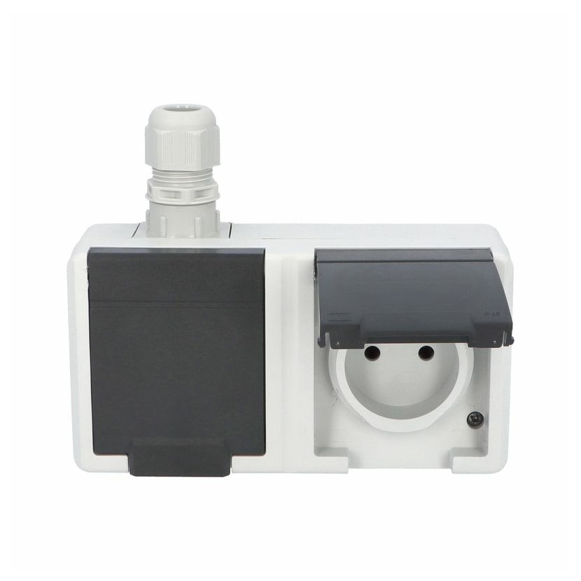 ATLAS 2K 19094-07 IP55 Přepínač č.6 + zásuvka 2x 2P+PE, 2-násobná vodorovně s ochr. kolíkem, na povrch, šedý. Provedení v šedé barvě RAL 7035 a ovládacím prvkem v barvě RAL 7016. Rozteč kotvících bodů…