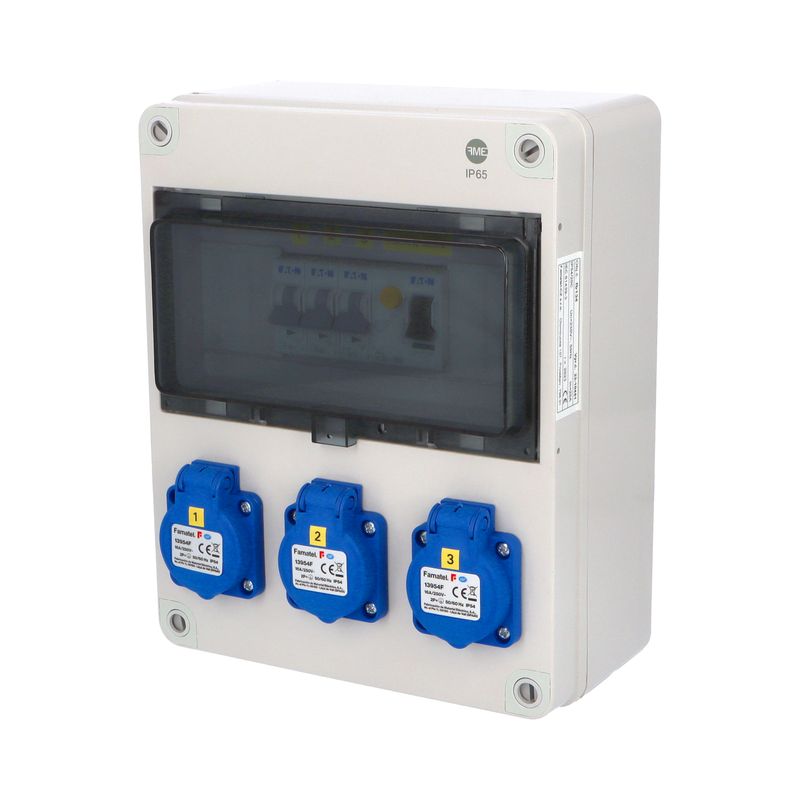 Zásuvková skříň FAMATEL v135-ZSF30000000.1 /3957 IP54 jištěná s chráničem 40/4/003-A, zásuvky 3x230V, přístroje EATON 10kA: 3xPL7-B16/1, PF7-40/4/003-A na vstupu, použité pouzdro: 3957 -…