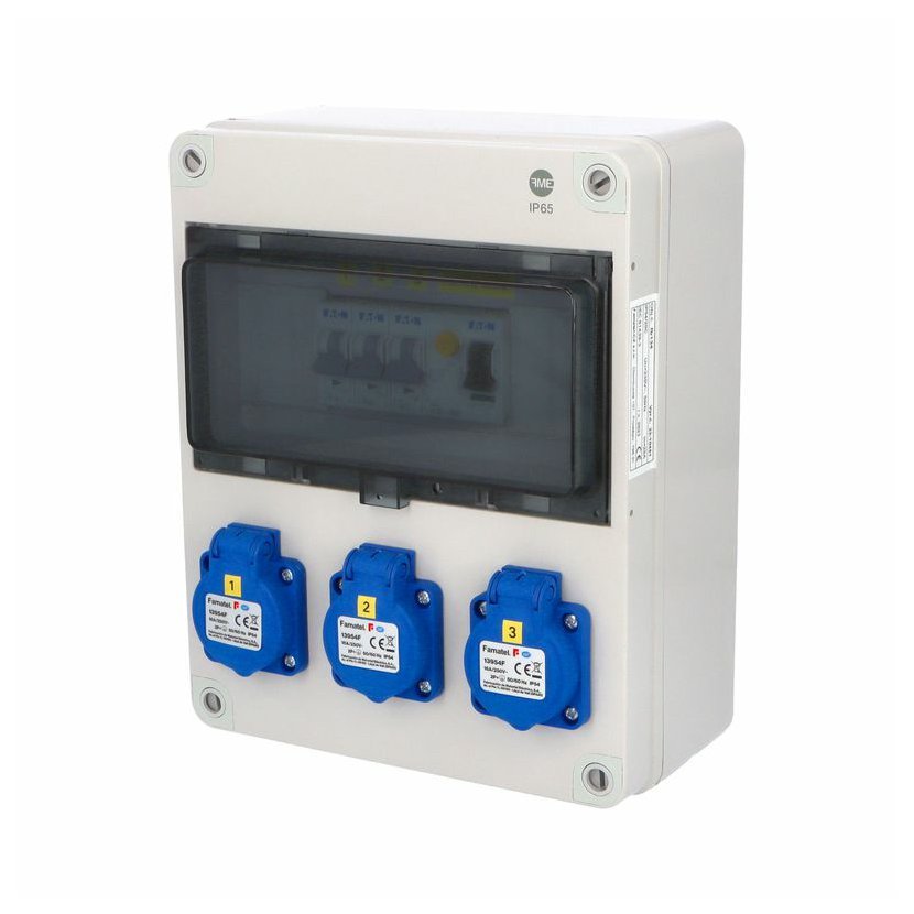 Zásuvková skříň FAMATEL fb13405-6kA - ZSF30000000.1 /5810 IP54 jištěná s chráničem 25/2/003-A, zásuvky 3x230V, přístroje EATON 6kA: 3xPL6-B16/1, PF6-25/2/003-A, na vstupu, použité pouzdro: 5810 -…
