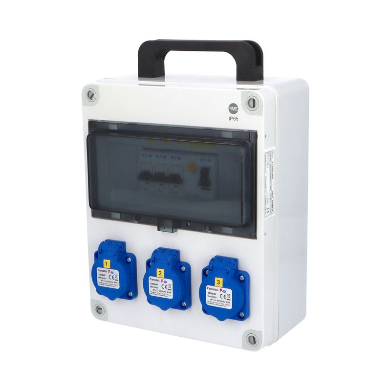 Zásuvková skříň FAMATEL fb32505-6kA - ZSF30101000.1 /5813 IP54 jištěná s chráničem 40/4/003-A, zásuvky 3x230V, 1x16/5, 1x32/5, přístroje EATON 6kA: 2xPL6-B16/1, 1xPL6-B16/3, 1xPL6-B32/3,…