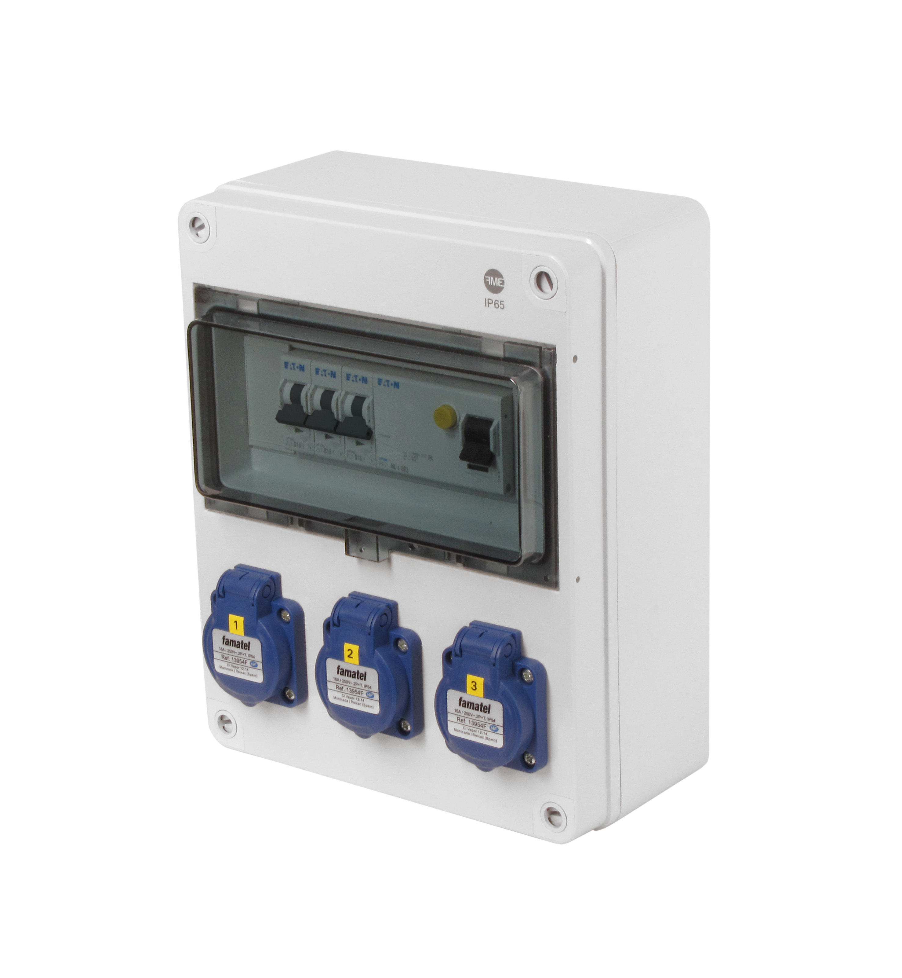 Zásuvková skříň FAMATEL fb32505-6kA - ZSF30101000.1 /5813 IP54 jištěná s chráničem 40/4/003-A, zásuvky 3x230V, 1x16/5, 1x32/5, přístroje EATON 6kA: 2xPL6-B16/1, 1xPL6-B16/3, 1xPL6-B32/3,…