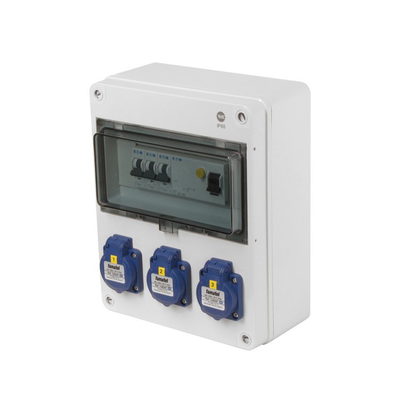 Zásuvková skříň FAMATEL v134-6kA - ZSF30000000.1 /3957 IP54 jištěná s chráničem 25/2/003-A, zásuvky 3x230V, přístroje EATON 6kA: 3xPL6-B16/1, PF6-25/2/003-A na vstupu, použité pouzdro: 3957 -…