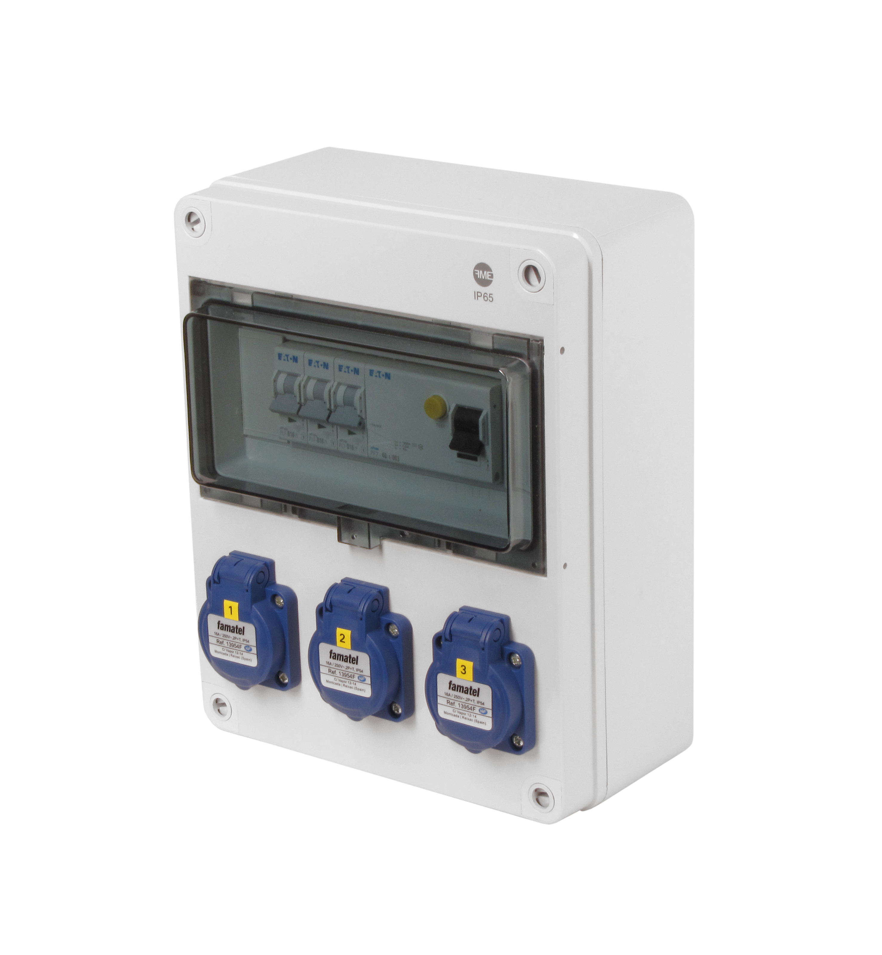 Zásuvková skříň FAMATEL rb553-RB30001000.1 /4102 IP65 jištěná s chráničem 40/4/003, zásuvky 3x230V, 1x32/5, přístroje EATON 10kA: 2xPL7-B16/1, 1xPL7-B32/3, PF7-40/4/003 na vstupu, použité pouzdro: :…