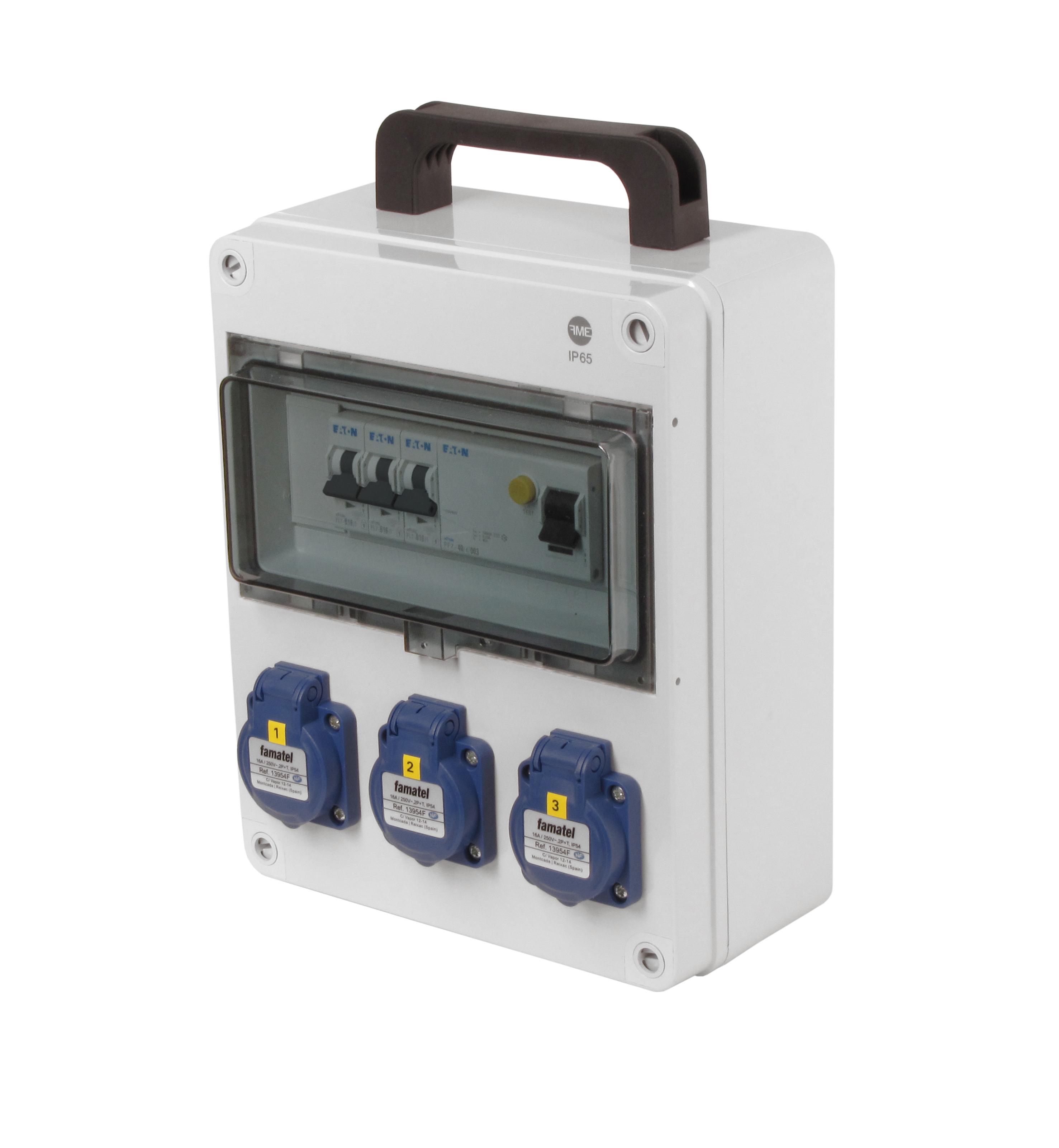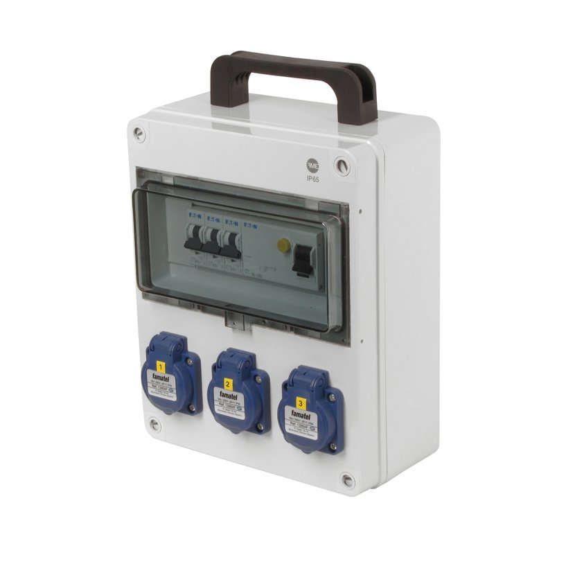 Zásuvková skříň FAMATEL v134-6kA - ZSF30000000.1 /3957 IP54 jištěná s chráničem 25/2/003-A, zásuvky 3x230V, přístroje EATON 6kA: 3xPL6-B16/1, PF6-25/2/003-A na vstupu, použité pouzdro: 3957 -…