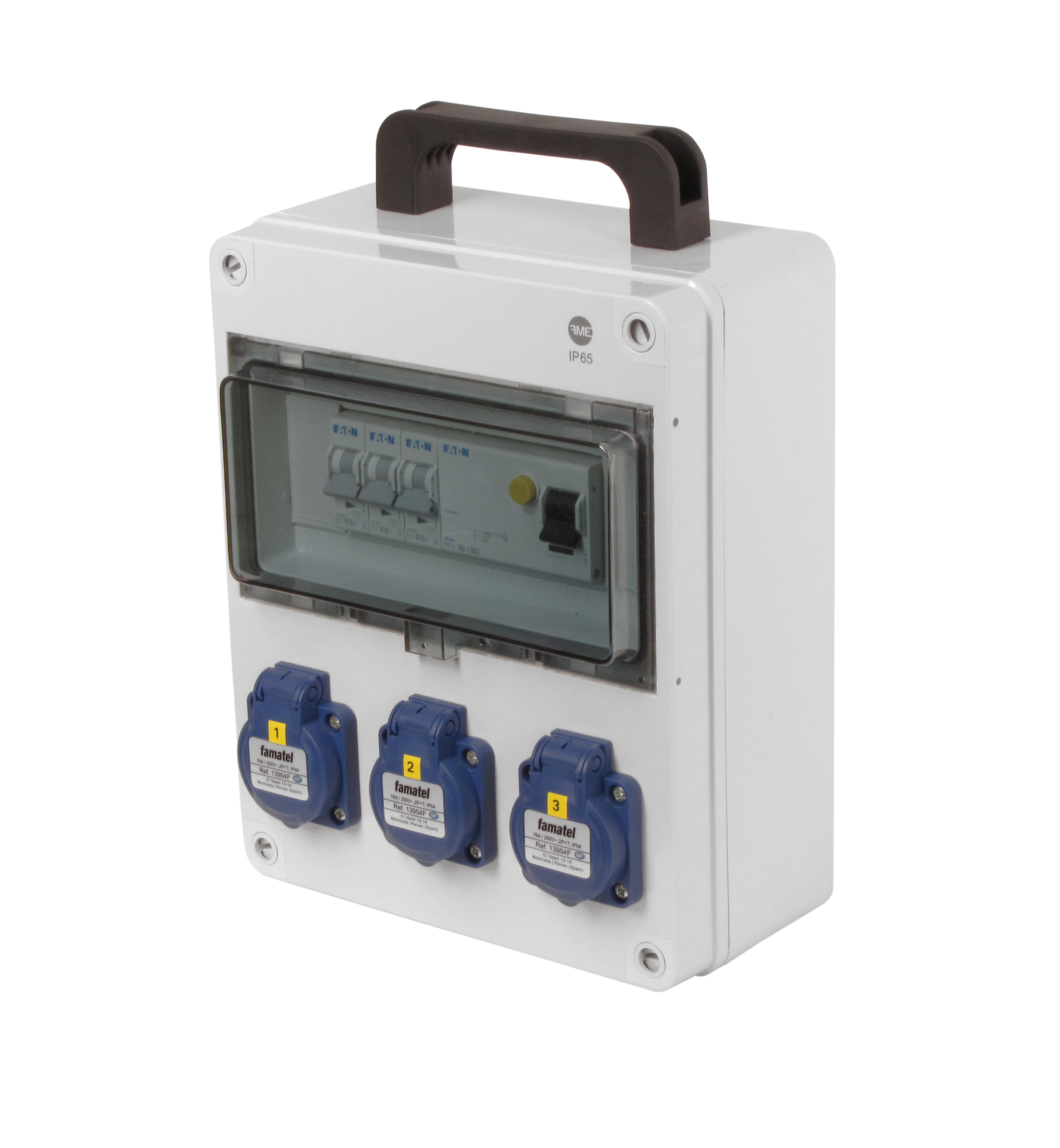 Zásuvková skříň FAMATEL v135-ZSF30000000.1 /3957 IP54 jištěná s chráničem 40/4/003-A, zásuvky 3x230V, přístroje EATON 10kA: 3xPL7-B16/1, PF7-40/4/003-A na vstupu, použité pouzdro: 3957 -…