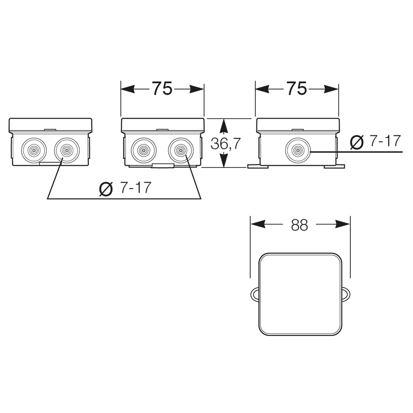 Parametre produktu Krabice K8 IP55 rozbočovací, s naklapávacím víčkem, 75x75x36mm