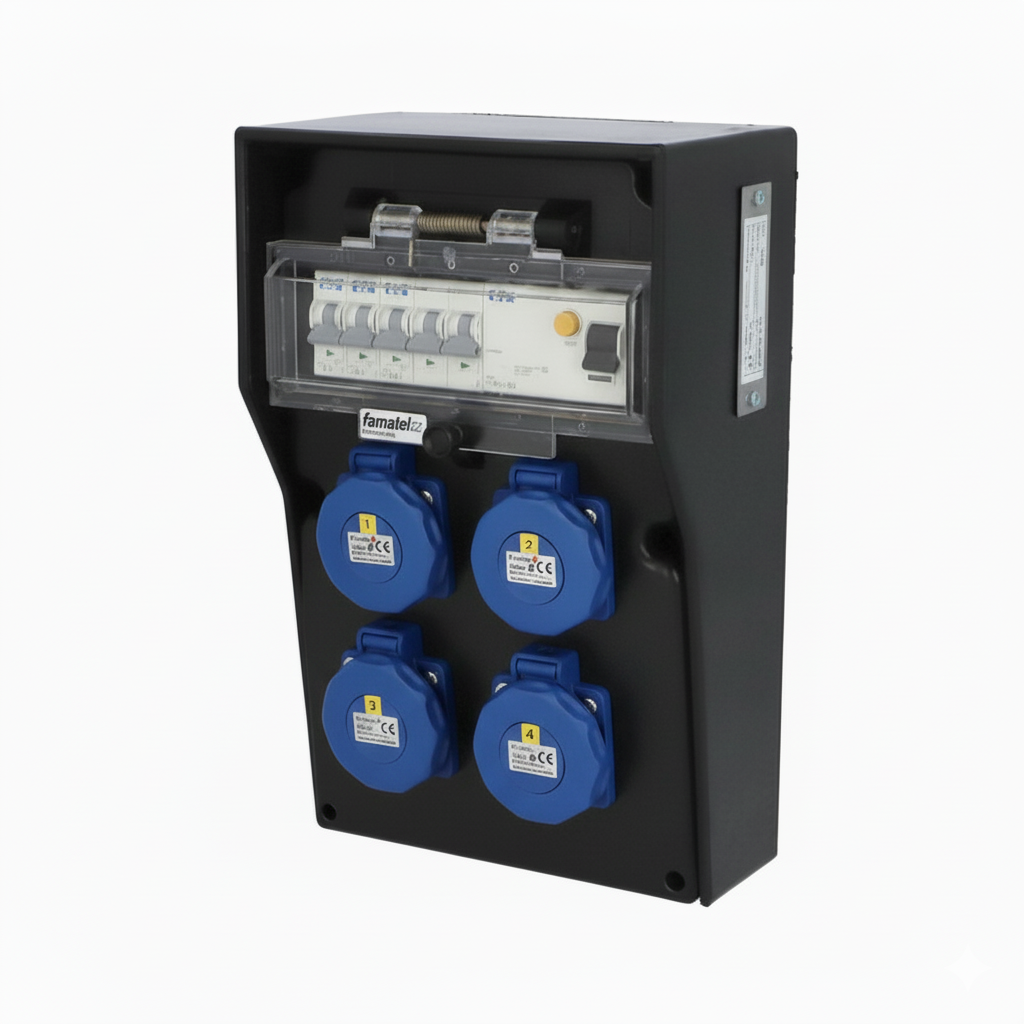 Zásuvková skříň FAMATEL fb1122 - ZSF40200000.1 /5813 IP54 jištěná s chráničem 40/4/003-A, zásuvky 4x230V, 2x16/5, přístroje EATON 10kA: 2xPL7-B16/1, 1xPL7-B16/3, PF7-40/4/003-A na vstupu, použité…