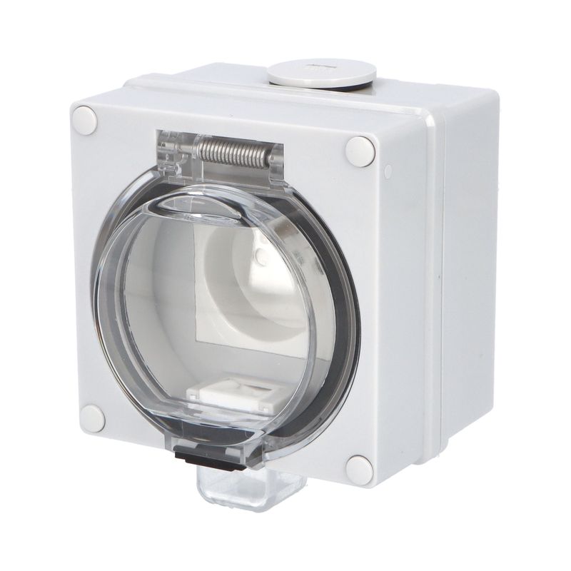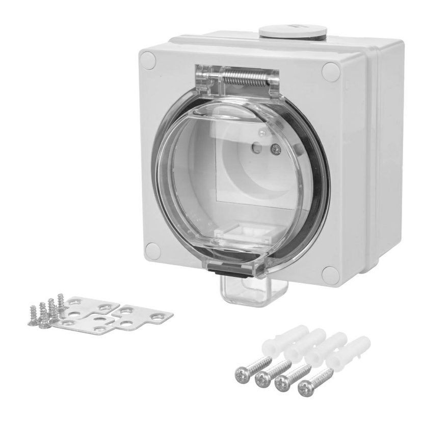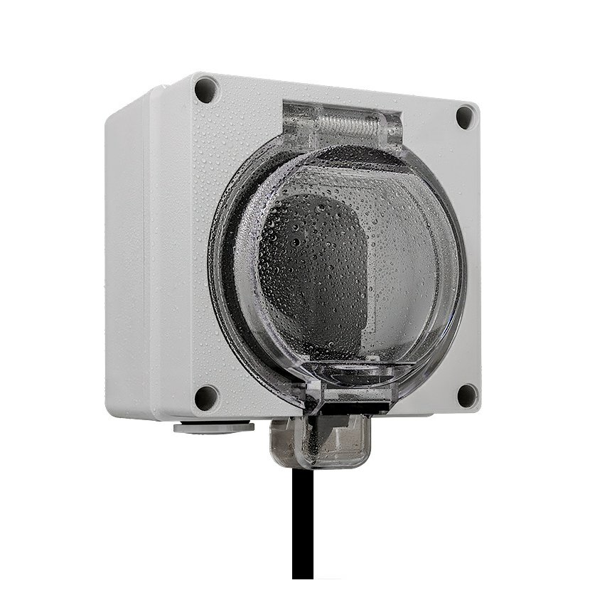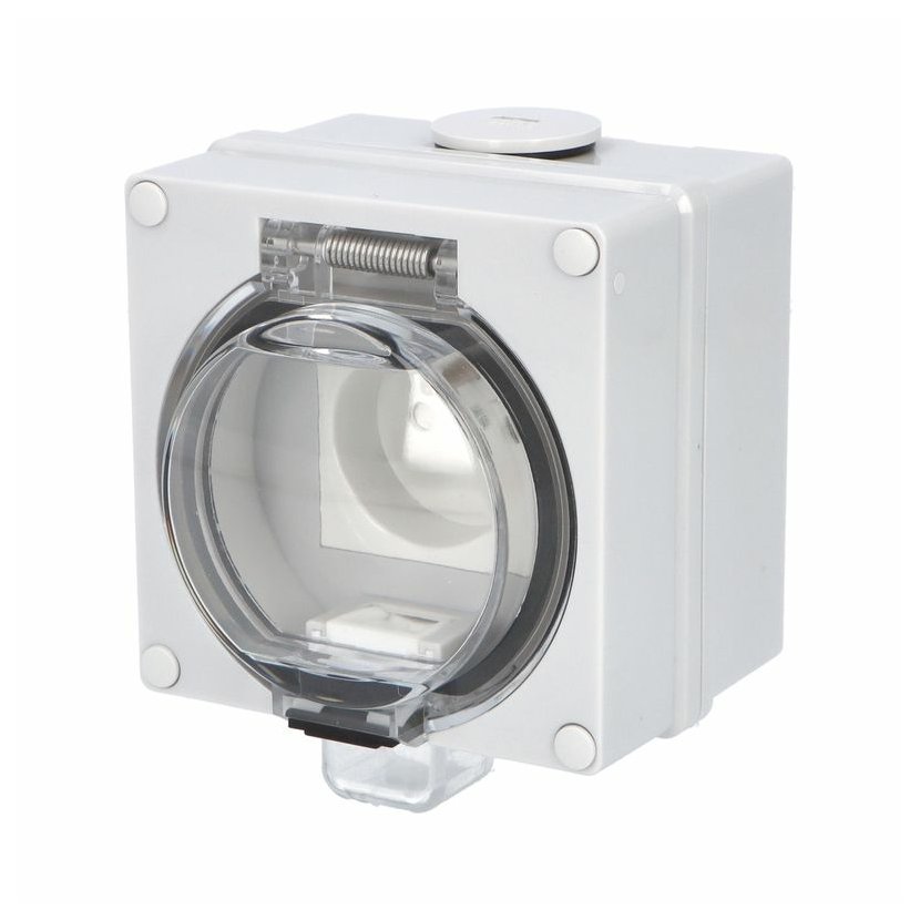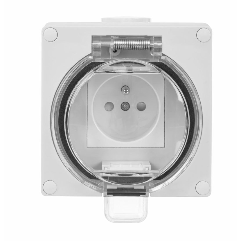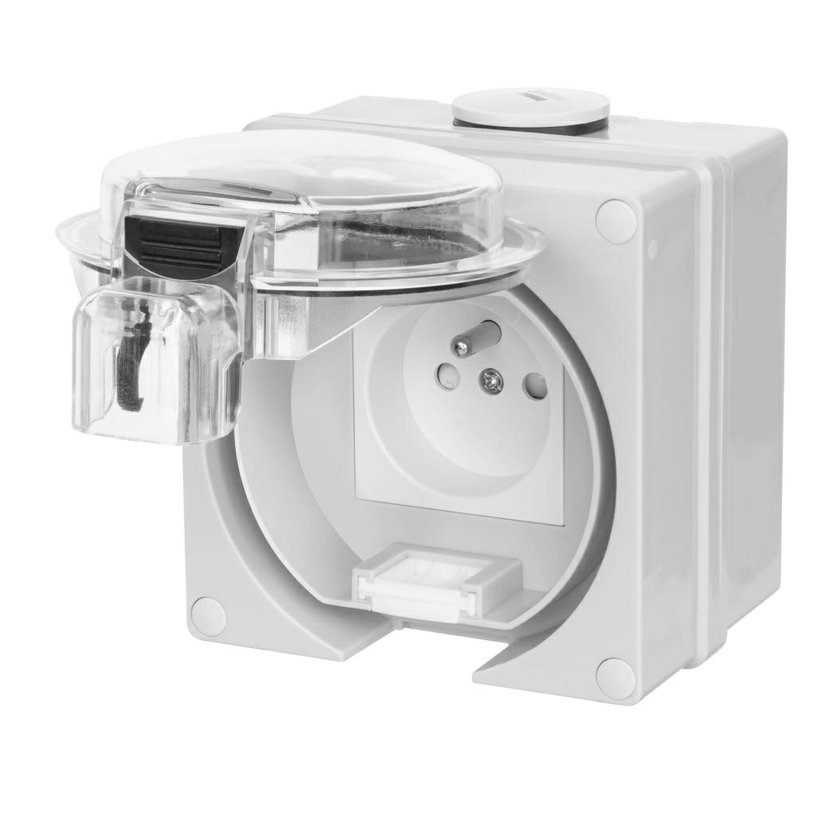 ATLAS 19082 IP55 Zásuvka 2P+PE s ochr. kolíkem, na povrch, šedá. Provedení v šedé barvě RAL 7035 a ovládacím prvkem v barvě RAL 7043. Rozteč kotvících bodů (výška x šířka ): 63x59mm.