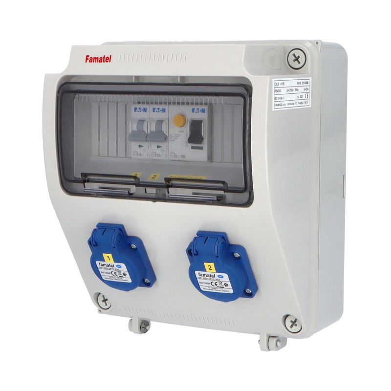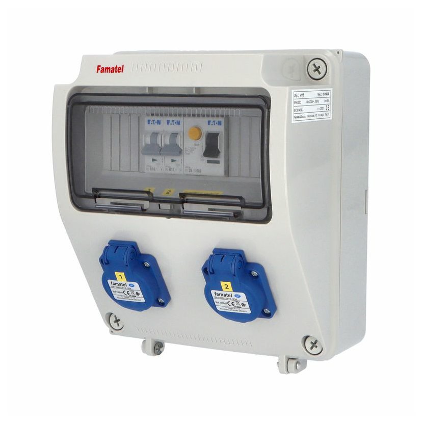 Zásuvková skříň FAMATEL fb190 - ZSF20001000.1 /5810 IP54 jištěná s chráničem 40/4/003-A, zásuvky 2x230V (natočené), 1x32/5, přístroje EATON 10kA: 2xPL7-B16/1, 1xPL7-B32/3, PF7-40/4/003-A na vstupu,…