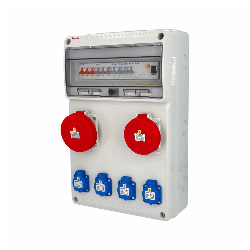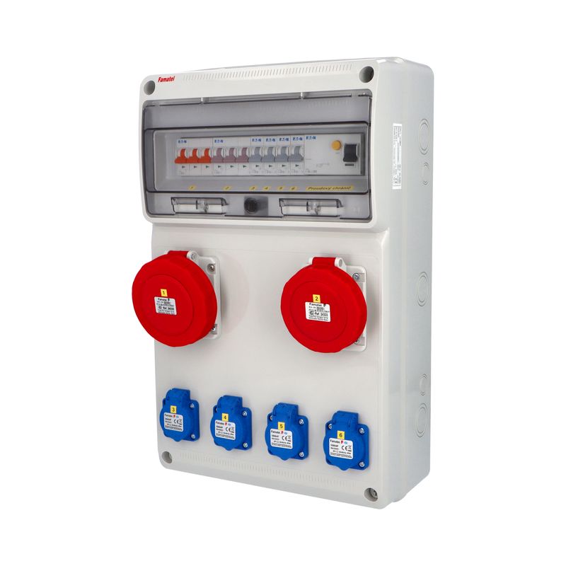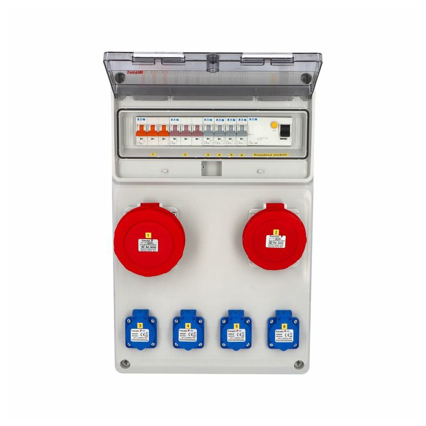 Zásuvková skříň FAMATEL v11807-ZSF40001010.1 /3952 IP54 jištěná s chráničem PF7-63/4/003-A, zásuvky 4x230V/16A (s ochranným kolíkem dle ČSN), 1x400V/32A/5pól, 1x400V/63A/5pól, přístroje EATON 10kA: 4xPL7-B16/1, 1xPL7-B32/3, PF7-63/4/003-A na vstupu (citlivost na reziduální proud 30mA), použité pouzdro: 3952 - celkem k dispozici 16mod. míst, rozměry: 500x330x155mm, plastová, materiál ABS, IK08, zkouška žhavou smyčkou 650°C, bezhalogenová a UV odolná, montáž na povrch, barva: světle šedá, rozsah teplot -25°C +85°C, aplikované normy: IEC 61439-3 (Rozváděče nízkého napětí - Část 3: Rozvodnice určené k provozování laiky (DBO), balení: 1ks (fólie), zásuvky na 230V/16A s ochranným kolíkem dle ČSN, polykarbonátové okénko, jistící prvky EATON, PE svorkovnice součástí (2ks 2x16mm2+4x10mm2), N svorkovnice součástí (2ks 2x16mm2+4x10mm2), stěny s předlisovanými vstupy pro vyvrtání vstupního otvoru a následné osazení příslušnou vývodkou (pro CYKY 5x6; 4x10; 5x10 => M25; pro CYKY 5x16 => M32), max. připojitelný vstupní kabel = 4x25 nebo 5x16 (Cu), dodáno s průvodní dokumentací: štítkem rozváděče, návodem pro obsluhu a montáž, krycím listem (charakteristiky rozhraní), protokolem o kusové zkoušce, EU prohlášením o shodě, schématem zapojení a zkouškou oteplení pro rozváděče nízkého napětí. Recyklační poplatek je zahrnut v ceně výrobku.