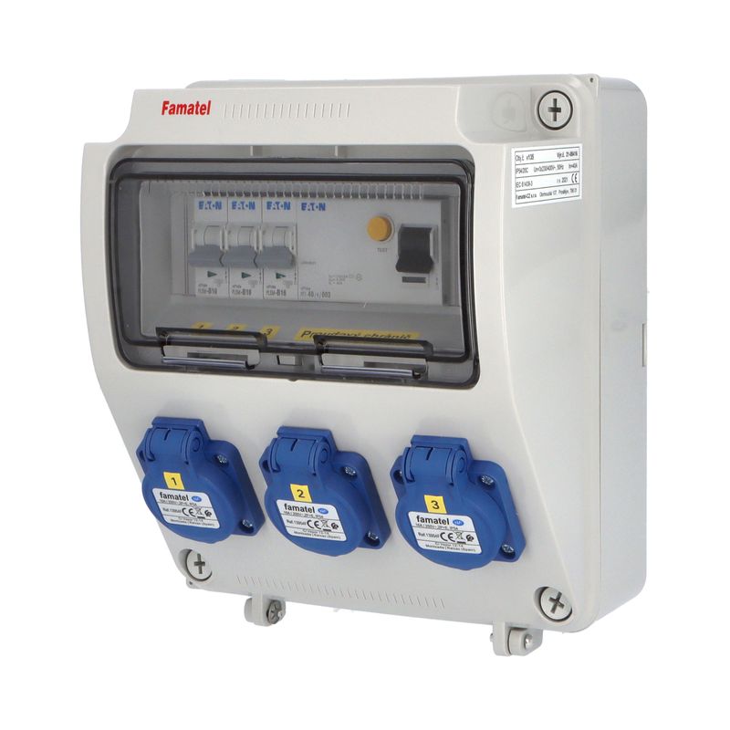 Zásuvková skříň FAMATEL fb13405 - ZSF30000000.1 /5810 IP54 jištěná s chráničem 25/2/003-A, zásuvky 3x230V, přístroje EATON 10kA: 3xPL7-B16/1, PF7-25/2/003-A, na vstupu, použité pouzdro: 5810 -…