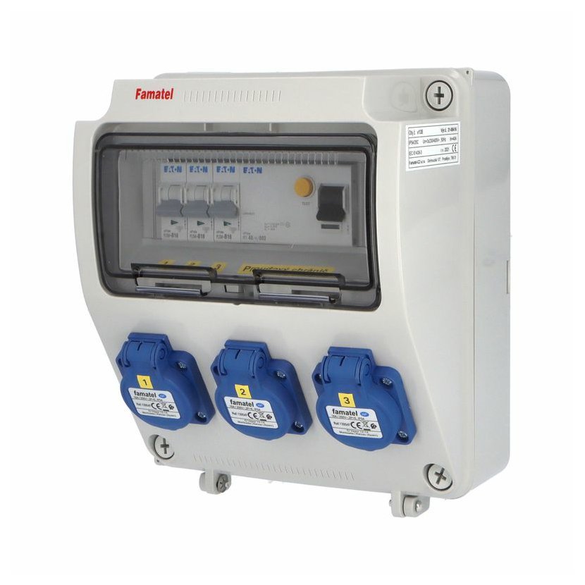 Zásuvková skříň FAMATEL rb55621 RB30002000.1 /4102 IP65 jištěná s chráničem 40/4/003-A, zásuvky 3x230V, 2x32/5, přístroje EATON 10kA: 3xPL7-B16/1, 1xPL7-B25/3, PF7-40/4/003-A na vstupu, vidlice 32A/5…