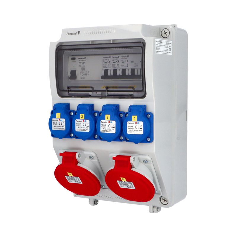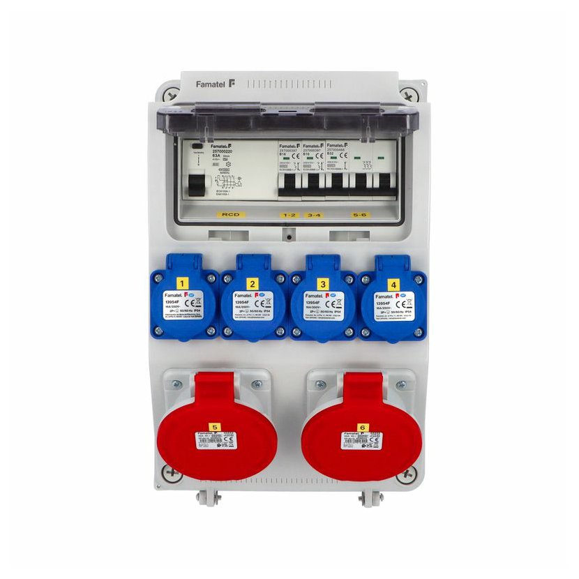 Zásuvková skříň (rozváděč nízkého napětí) FAMATEL vf1128-ZSF40002000.1 /3958 IP54 jištěná s chráničem 63/4/003-A, zásuvky 4x230V/16A (s ochranným kolíkem dle ČSN), 2x400V/32A/5pól, jistící přístroje FAMATEL 10kA: 2x KBS1B16 B16/1, 1x KBS3B32 B32/3, AUR8463A030 63/4/003-A na vstupu (citlivost na reziduální proud 30mA), použité pouzdro: 3958 - celkem k dispozici 9mod. míst, rozměry: 330x215x155mm, plastová, materiál ABS, IK08, zkouška žhavou smyčkou 650°C, bezhalogenová a UV odolná, montáž na povrch, barva: světle šedá, rozsah teplot -25°C +85°C, aplikované normy: IEC 61439-3 (Rozváděče nízkého napětí - Část 3: Rozvodnice určené k provozování laiky (DBO), balení: 1ks (fólie), zásuvky na 230V/16A s ochranným kolíkem dle ČSN, polykarbonátové okénko, jistící prvky FAMATEL, PE svorkovnice součástí (6x16mm2), N svorkovnice součástí (6x16mm2), hladké stěny (bez prolisů) pro vyvrtání vstupního otvoru a následné osazení příslušnou vývodkou (pro CYKY 5x6; 4x10; 5x10 => M25; pro CYKY 5x16 => M32), max. připojitelný vstupní kabel = 4x25 nebo 5x16 (Cu), dodáno s průvodní dokumentací: štítkem rozváděče, návodem pro obsluhu a montáž, krycím listem (charakteristiky rozhraní), protokolem o kusové zkoušce, ES prohlášením o shodě, schématem zapojení a zkouškou oteplení pro rozváděče nízkého napětí. Pro montáž na hořlavé podklady je nutné použít nehořlavou podložku. Recyklační poplatek je zahrnut v ceně výrobku.
