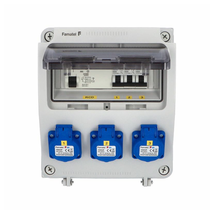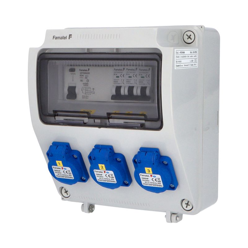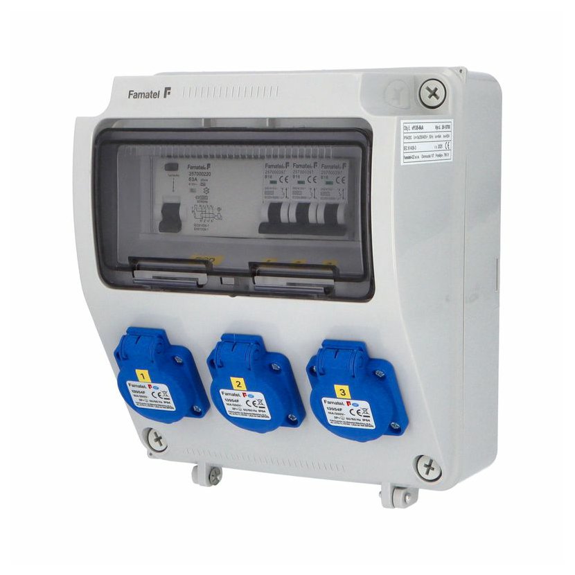 Zásuvková skříň (rozváděč nízkého napětí) FAMATEL vf135-ZSF30000000.1 /3957 IP54 jištěná s chráničem 63/4/003-A, zásuvky 3x230V/16A, jistící přístroje FAMATEL 10kA: 3xKBS1B16 B16/1, AUR8463A030 63/4/003-A, na vstupu (citlivost na reziduální proud 30mA), použité pouzdro: 3957 - celkem k dispozici 9mod. míst, rozměry: 245x215x155mm, plastová, materiál ABS, IK08, zkouška žhavou smyčkou 650°C, bezhalogenová a UV odolná, montáž na povrch, barva: světle šedá, rozsah teplot -25°C +85°C, aplikované normy: IEC 61439-3 (Rozváděče nízkého napětí - Část 3: Rozvodnice určené k provozování laiky (DBO), balení: 1ks (fólie), zásuvky na 230V/16A s ochranným kolíkem dle ČSN, polykarbonátové okénko, jistící prvky FAMATEL, PE svorkovnice součástí (6x16mm2), N svorkovnice součástí (6x16mm2), hladké stěny (bez prolisů) pro vyvrtání vstupního otvoru a následné osazení příslušnou vývodkou (pro CYKY 5x6; 4x10; 5x10 => M25; pro CYKY 5x16 => M32), max. připojitelný vstupní kabel = 4x25 nebo 5x16 (Cu), dodáno s průvodní dokumentací: štítkem rozváděče, návodem pro obsluhu a montáž, krycím listem (charakteristiky rozhraní), protokolem o kusové zkoušce, ES prohlášením o shodě, schématem zapojení a zkouškou oteplení pro rozváděče nízkého napětí. Pro montáž na hořlavé podklady je nutné použít nehořlavou podložku. Recyklační poplatek je zahrnut v ceně výrobku.