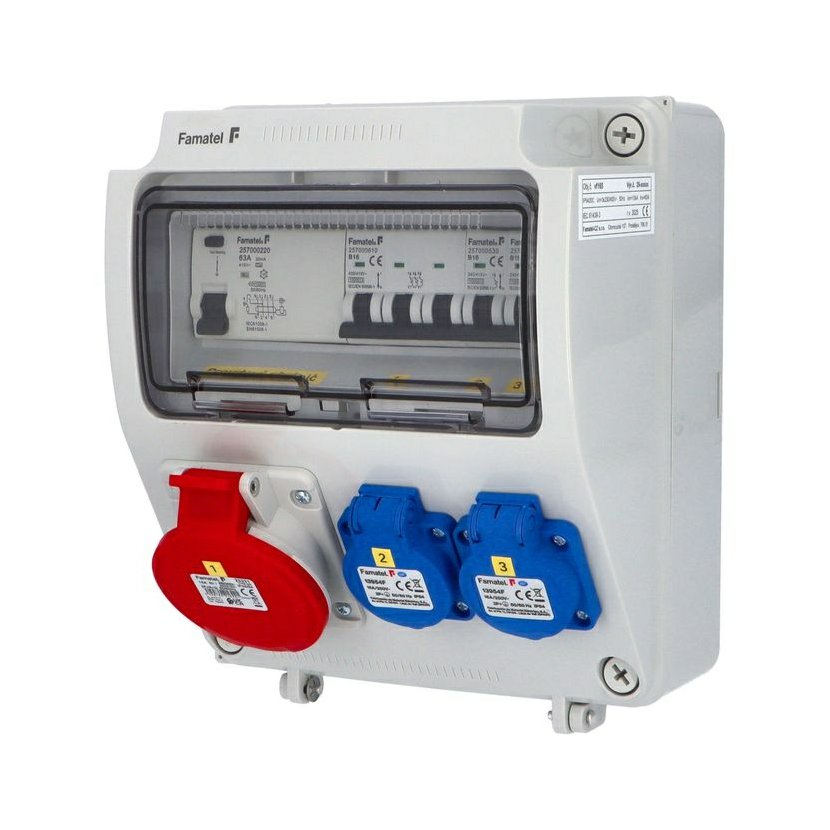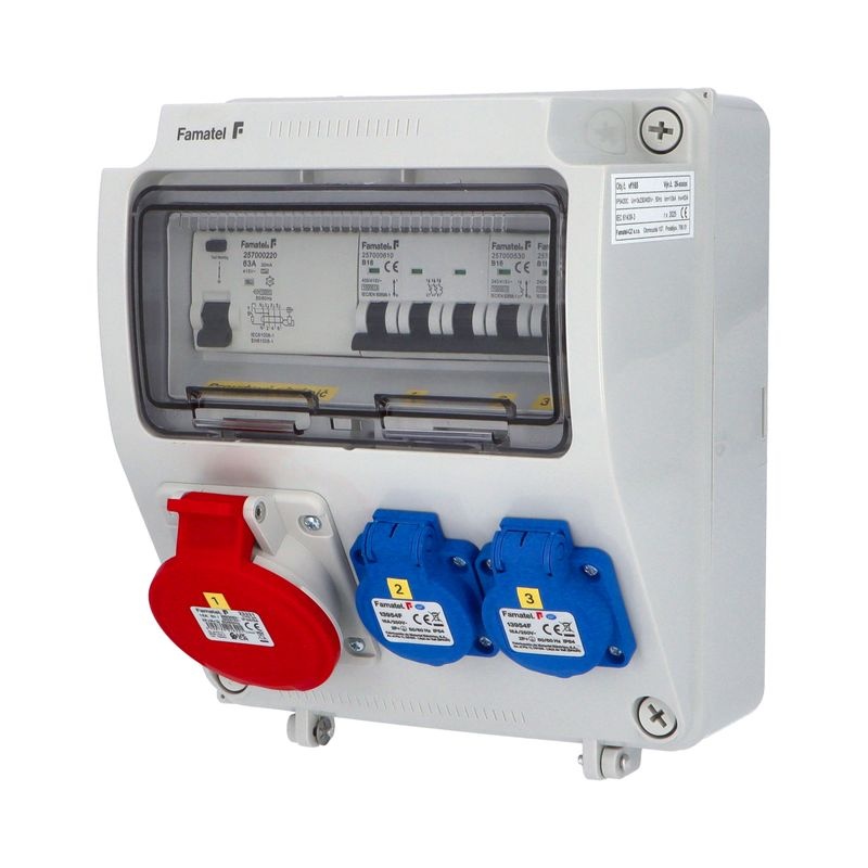 Zásuvková skříň (rozváděč nízkého napětí) FAMATEL vf165-4pol-ZSF20010000.1 /3957 IP54/IP20C jištěná s chráničem 63/4/003-A, zásuvky 2x230V/16A (s ochranným kolíkem dle ČSN), 1x400V/16A/4pól, jistící přístroje FAMATEL 10kA: 2xKBS1B16 B16/1, 1xKBS3B16 B16/3, AUR8463A030 63/4/003-A na vstupu (citlivost na reziduální proud 30mA), použité pouzdro: 3957 - celkem k dispozici 9mod. míst, rozměry: 245x215x155mm, plastová, materiál ABS, IK08, zkouška žhavou smyčkou 650°C, bezhalogenová a UV odolná, montáž na povrch, barva: světle šedá, rozsah teplot -25°C +85°C, aplikované normy: IEC 61439-3 (Rozváděče nízkého napětí - Část 3: Rozvodnice určené k provozování laiky (DBO), balení: 1ks (fólie), zásuvky na 230V/16A s ochranným kolíkem dle ČSN, polykarbonátové okénko, jistící prvky FAMATEL, PE svorkovnice součástí (6x16mm2), N svorkovnice součástí (6x16mm2), hladké stěny (bez prolisů) pro vyvrtání vstupního otvoru a následné osazení příslušnou vývodkou (pro CYKY 5x6; 4x10; 5x10 => M25; pro CYKY 5x16 => M32), max. připojitelný vstupní kabel = 4x25 nebo 5x16 (Cu), dodáno s průvodní dokumentací: štítkem rozváděče, návodem pro obsluhu a montáž, krycím listem (charakteristiky rozhraní), protokolem o kusové zkoušce, ES prohlášením o shodě, schématem zapojení a zkouškou oteplení pro rozváděče nízkého napětí. Pro montáž na hořlavé podklady je nutné použít nehořlavou podložku. Recyklační poplatek je zahrnut v ceně výrobku.
