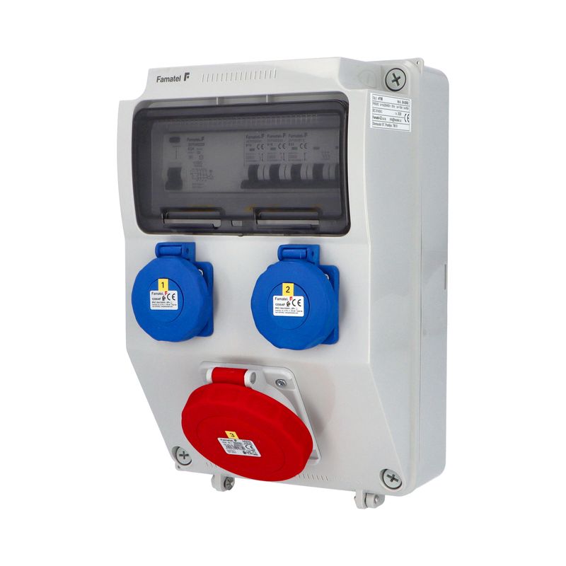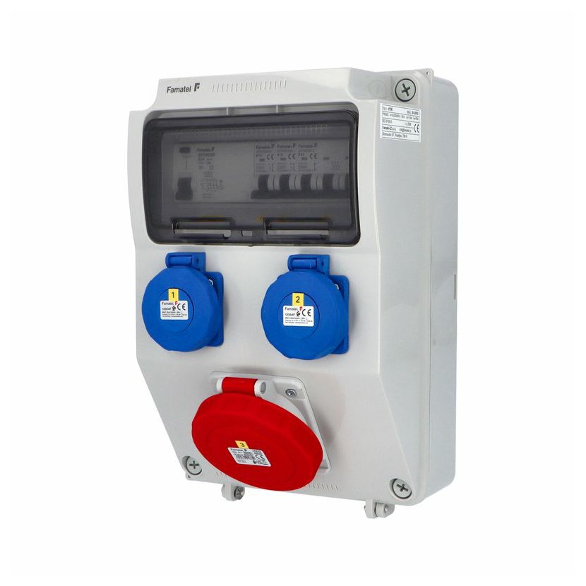 Zásuvková skříň (rozváděč nízkého napětí) FAMATEL vf196-ZSF20001000.1 /3958 IP65 jištěná s chráničem 63/4/003-A, zásuvky 2x230V/16A (s ochranným kolíkem dle ČSN), 1x400V/32A/5pól, jistící přístroje FAMATEL 10kA: 2x KBS3B16 B16/1, 1x KBS3B32 B32/3, AUR8463A030 63/4/003-A na vstupu (citlivost na reziduální proud 30mA), použité pouzdro: 3958 - celkem k dispozici 9mod. míst, rozměry: 330x215x155mm, plastová, materiál ABS, IK08, zkouška žhavou smyčkou 650°C, bezhalogenová a UV odolná, montáž na povrch, barva: světle šedá, rozsah teplot -25°C +85°C, aplikované normy: IEC 61439-3 (Rozváděče nízkého napětí - Část 3: Rozvodnice určené k provozování laiky (DBO), balení: 1ks (fólie), zásuvky na 230V/16A s ochranným kolíkem dle ČSN, polykarbonátové okénko, jistící prvky FAMATEL, PE svorkovice součástí (6x16mm2), N svorkovice součástí (6x16mm2), hladké stěny (bez prolisů) pro vyvrtání vstupního otvoru a následné osazení příslušnou vývodkou (pro CYKY 5x6; 4x10; 5x10 => M25; pro CYKY 5x16 => M32), max. připojitelný vstupní kabel = 4x25 nebo 5x16 (Cu), dodáno s průvodní dokumentací: štítkem rozváděče, návodem pro obsluhu a montáž, krycím listem (charakteristiky rozhraní), protokolem o kusové zkoušce, ES prohlášením o shodě, schématem zapojení a zkouškou oteplení pro rozváděče nízkého napětí. Pro montáž na hořlavé podklady je nutné použít nehořlavou podložku. Recyklační poplatek je zahrnut v ceně výrobku.