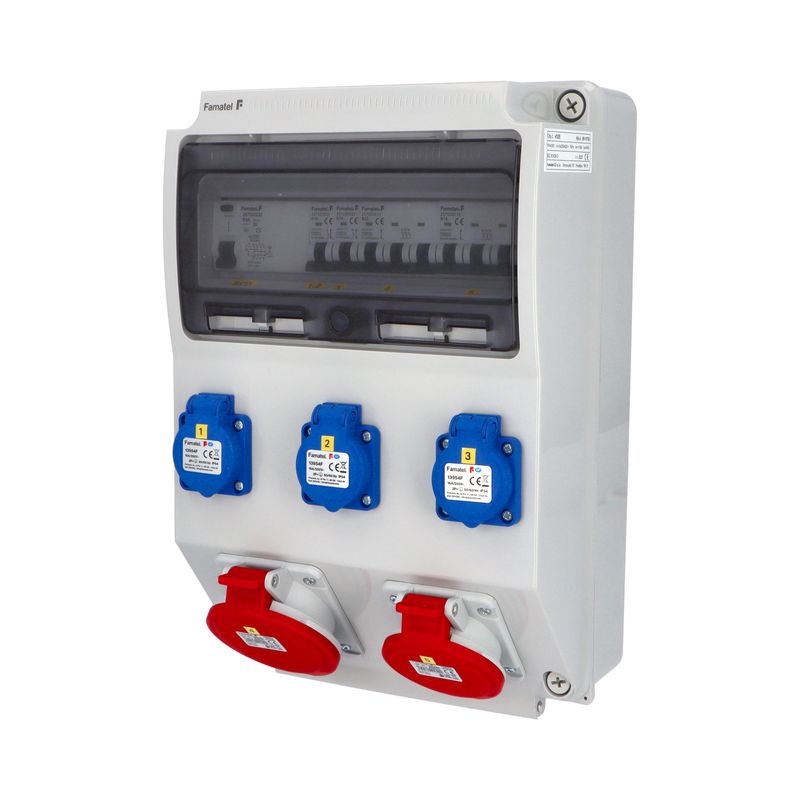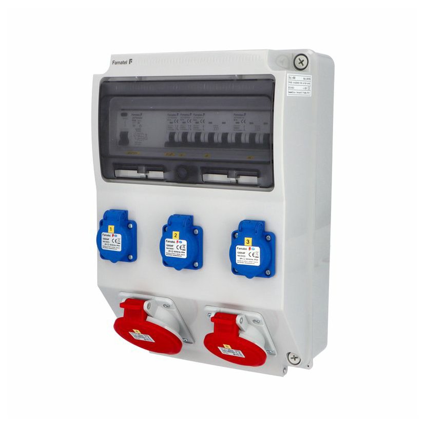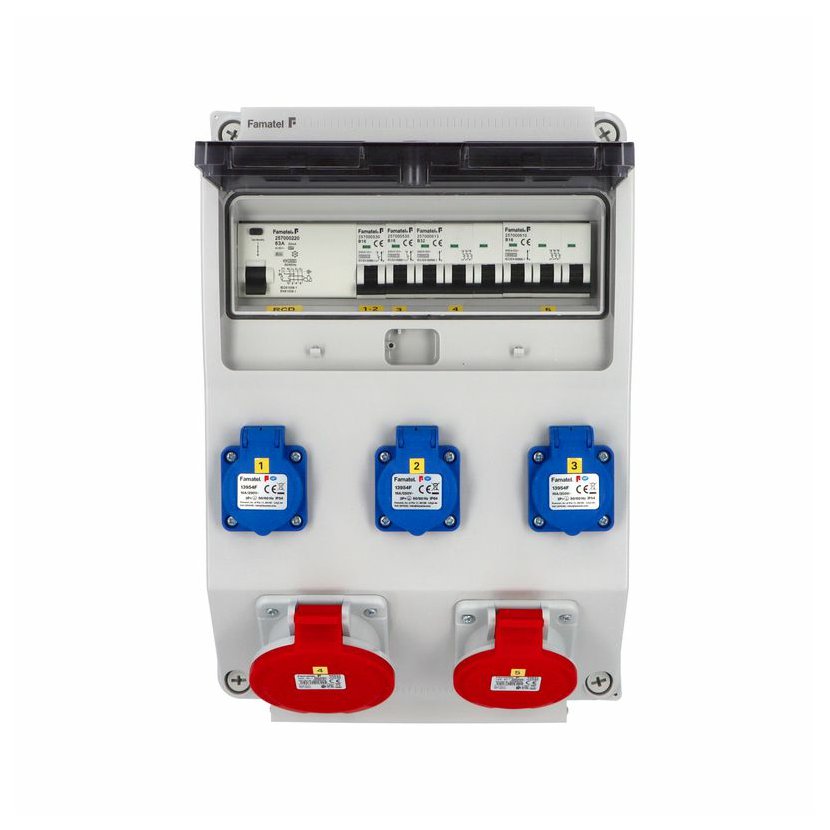 Zásuvková skříň (rozváděč nízkého napětí) FAMATEL vf325-ZSF30101000.1 /3959 IP54 jištěná s chráničem 63/4/003-A, zásuvky 3x230V/16A (s ochranným kolíkem dle ČSN), 1x400V/16A/5pól, 1x400V/32A/5pól, jistící přístroje FAMATEL 10kA: 2xKKS1B16 B16/1, 1xKKS3B16 B16/3, 1xKKS3B32 B32/3, AUR8463A030 63/4/003-A na vstupu (citlivost na reziduální proud 30mA), použité pouzdro: 3959 - celkem k dispozici 12mod. míst, rozměry: 398x266x153mm, plastová, materiál ABS, IK08, zkouška žhavou smyčkou 650°C, bezhalogenová a UV odolná, montáž na povrch, barva: světle šedá, rozsah teplot -25°C +85°C, aplikované normy: IEC 61439-3 (Rozváděče nízkého napětí - Část 3: Rozvodnice určené k provozování laiky (DBO), balení: 1ks (fólie), zásuvky na 230V/16A s ochranným kolíkem dle ČSN, polykarbonátové okénko, jistící prvky FAMATEL, PE svorkovnice součástí (6x16mm2), N svorkovnice součástí (6x16mm2), stěny s předlisovanými vstupy pro vyvrtání vstupního otvoru a následné osazení příslušnou vývodkou (pro CYKY 5x6; 4x10; 5x10 => M25; pro CYKY 5x16 => M32), max. připojitelný vstupní kabel = 4x25 nebo 5x16 (Cu), dodáno s průvodní dokumentací: štítkem rozváděče, návodem pro obsluhu a montáž, krycím listem (charakteristiky rozhraní), protokolem o kusové zkoušce, ES prohlášením o shodě, schématem zapojení a zkouškou oteplení pro rozváděče nízkého napětí. Pro montáž na hořlavé podklady je nutné použít nehořlavou podložku. Recyklační poplatek je zahrnut v ceně výrobku.