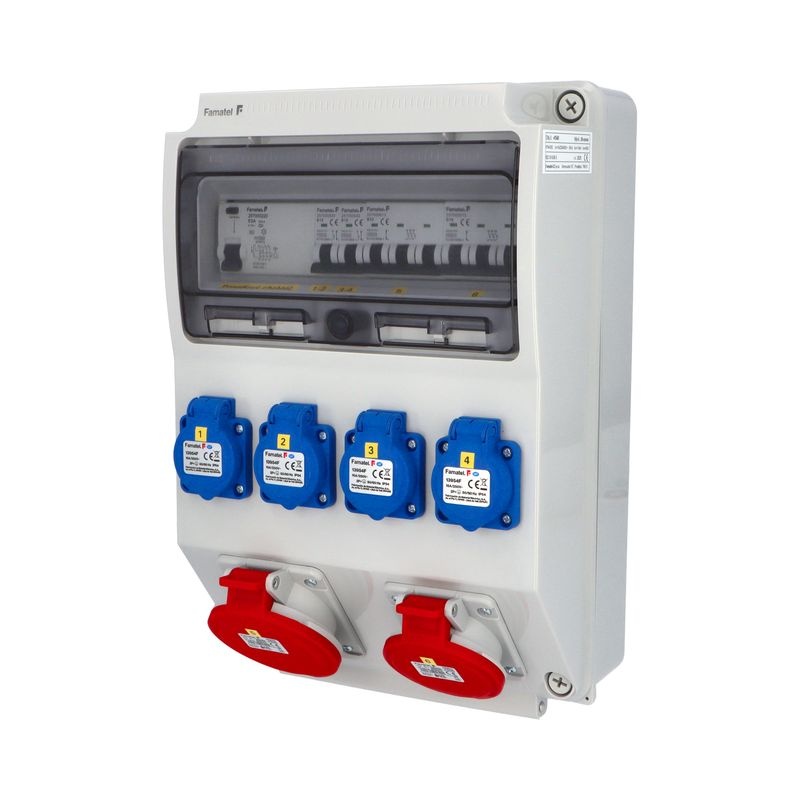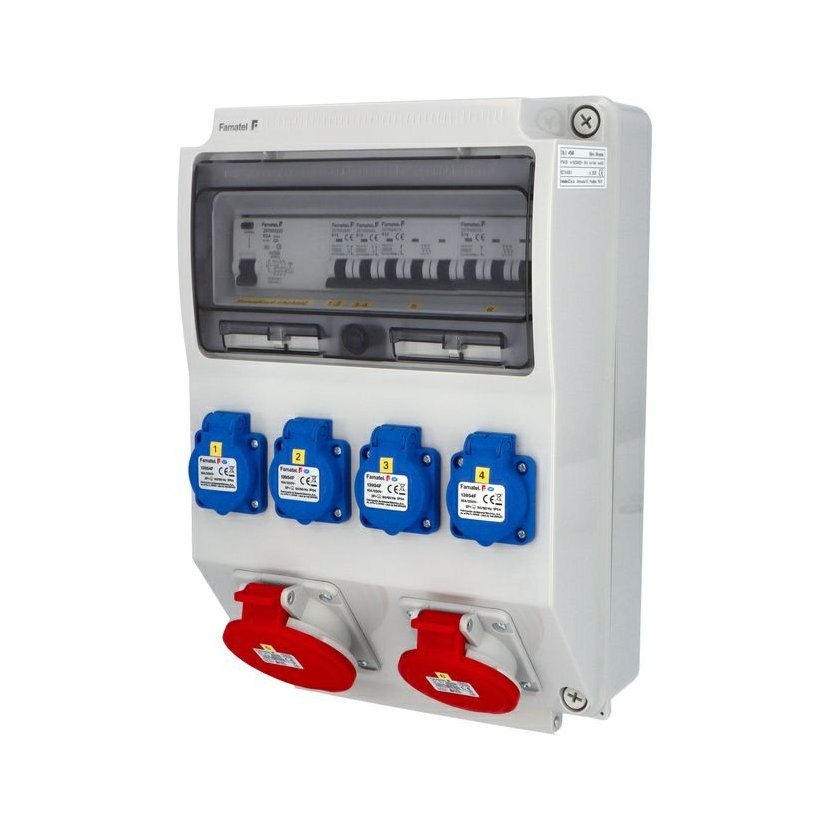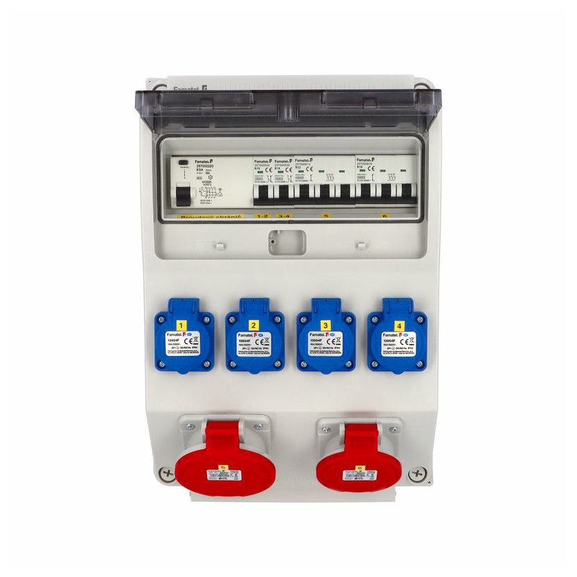 Zásuvková skříň FAMATEL vf625-ZSF40101000.1 /3952 IP54 jištěná s chráničem 63/4/003-A, zásuvky 4x230V, 1x16/5, 1x32/5, přístroje FAMATEL 10kA: 2xKBS1B16 B16/1, 1xKBS3B16 B16/3, 1xKBS3B32 B32/3,…