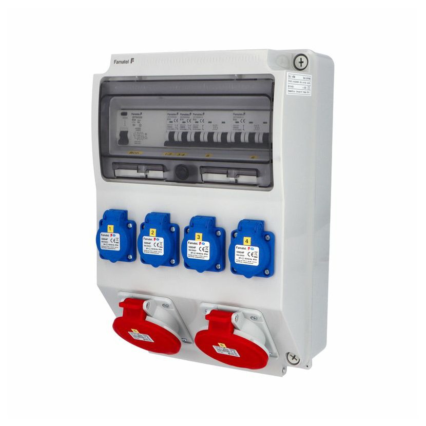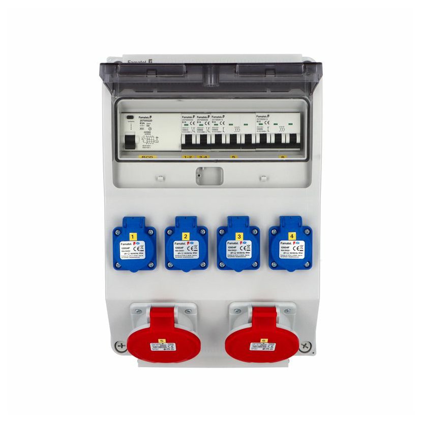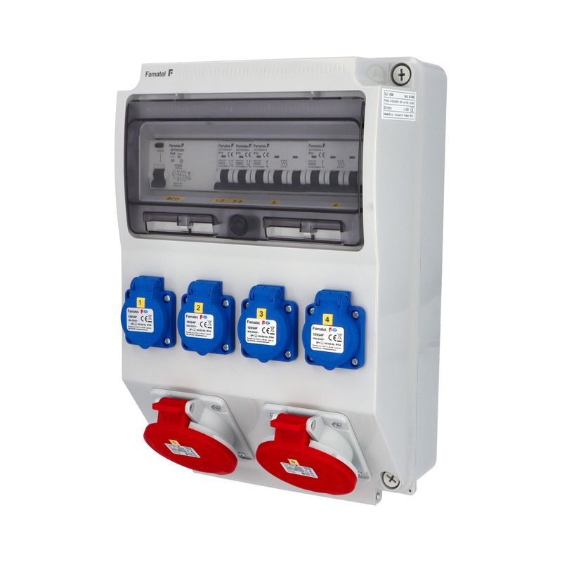 Zásuvková skříň (rozváděč nízkého napětí) FAMATEL vf348-ZSF40002000.1 /3959 IP54 jištěná s chráničem 63/4/003-A, zásuvky 4x230V/16A (s ochranným kolíkem dle ČSN), 2x400V/32A/5pól, jistící přístroje FAMATEL 10kA: 2xPKBS1B16 B16/1, 2xKBS3B32 B32/3, AUR8463A030 63/4/003-A na vstupu (citlivost na reziduální proud 30mA), použité pouzdro: 3959 - celkem k dispozici 12mod. míst, rozměry: 398x266x153mm, plastová, materiál ABS, IK08, zkouška žhavou smyčkou 650°C, bezhalogenová a UV odolná, montáž na povrch, barva: světle šedá, rozsah teplot -25°C + 85°C, aplikované normy: IEC 61439-3 (Rozváděče nízkého napětí - Část 3: Rozvodnice určené k provozování laiky (DBO), balení: 1ks (fólie), zásuvky na 230V/16A s ochranným kolíkem dle ČSN, polykarbonátové okénko, jistící prvky FAMATEL, PE svorkovnice součástí (6x16mm2), N svorkovnice součástí (6x16mm2), stěny s předlisovanými vstupy pro vyvrtání vstupního otvoru a následné osazení příslušnou vývodkou (pro CYKY 5x6; 4x10; 5x10 => M25; pro CYKY 5x16 => M32), max. připojitelný vstupní kabel = 4x25 nebo 5x16 (Cu), dodáno s průvodní dokumentací: štítkem rozváděče, návodem pro obsluhu a montáž, krycím listem (charakteristiky rozhraní), protokolem o kusové zkoušce, ES prohlášením o shodě, schématem zapojení a zkouškou oteplení pro rozváděče nízkého napětí. Pro montáž na hořlavé podklady je nutné použít nehořlavou podložku. Recyklační poplatek je zahrnut v ceně výrobku.