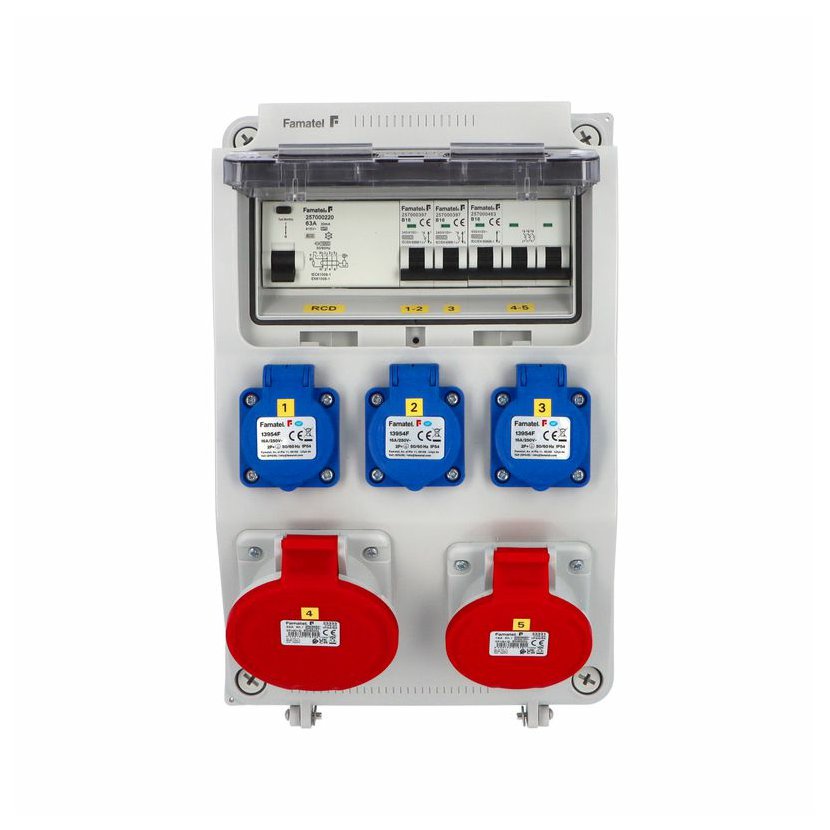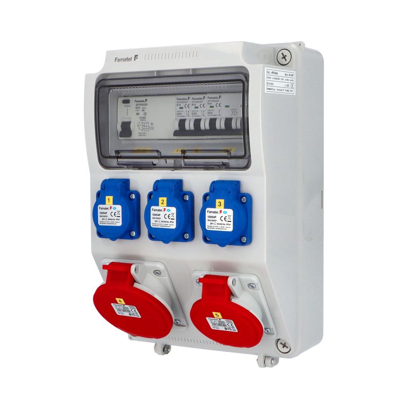 Zásuvková skříň (rozváděč nízkého napětí) FAMATEL vf510-ZSF30101000.1 /3958 IP54 jištěná s chráničem 63/4/003-A (ekonomická varianta), zásuvky 3x230V/16A (s ochranným kolíkem dle ČSN), 1x400V/16A/5pól, 1x400V/32A/5pól, jistící přístroje FAMATEL 10kA: 2xKBS1B16 B16/1, 1xKBS3B16 B16/3 (společný pro 3fáz. zásuvky), AUR8463A030 63/4/003-A na vstupu (citlivost na reziduální proud 30mA), použité pouzdro: 3958 - celkem k dispozici 9mod. míst, rozměry: 330x215x155mm, plastová, materiál ABS, IK08, zkouška žhavou smyčkou 650°C, bezhalogenová a UV odolná, montáž na povrch, barva: světle šedá, rozsah teplot -25°C + 85°C, aplikované normy: IEC 61439-3 (Rozváděče nízkého napětí - Část 3: Rozvodnice určené k provozování laiky (DBO), balení: 1ks (fólie), zásuvky na 230V/16A s ochranným kolíkem dle ČSN, polykarbonátové okénko, jistící prvky FAMATEL, PE svorkovnice součástí (6x16mm2), N svorkovnice součástí (6x16mm2), hladké stěny (bez prolisů) pro vyvrtání vstupního otvoru a následné osazení příslušnou vývodkou (pro CYKY 5x6; 4x10; 5x10 => M25; pro CYKY 5x16 => M32), max. připojitelný vstupní kabel = 4x25 nebo 5x16 (Cu), dodáno s průvodní dokumentací: štítkem rozváděče, návodem pro obsluhu a montáž, krycím listem (charakteristiky rozhraní), protokolem o kusové zkoušce, ES prohlášením o shodě, schématem zapojení a zkouškou oteplení pro rozváděče nízkého napětí. Pro montáž na hořlavé podklady je nutné použít nehořlavou podložku. Recyklační poplatek je zahrnut v ceně výrobku.