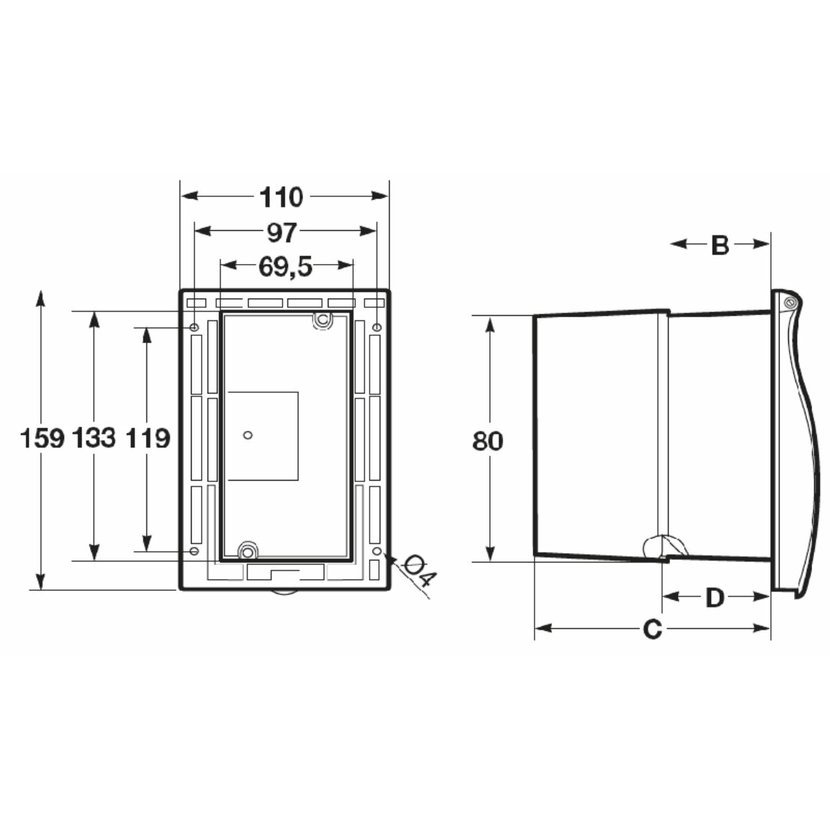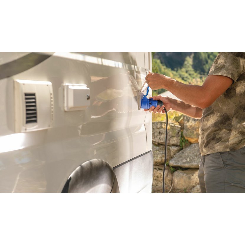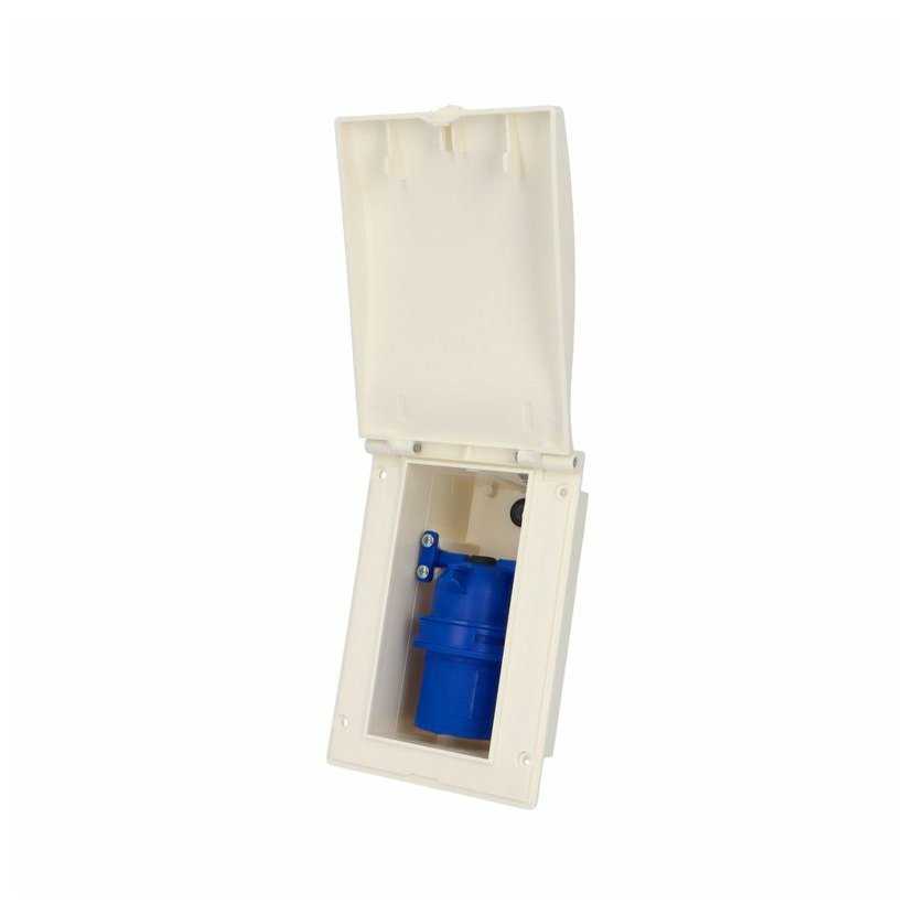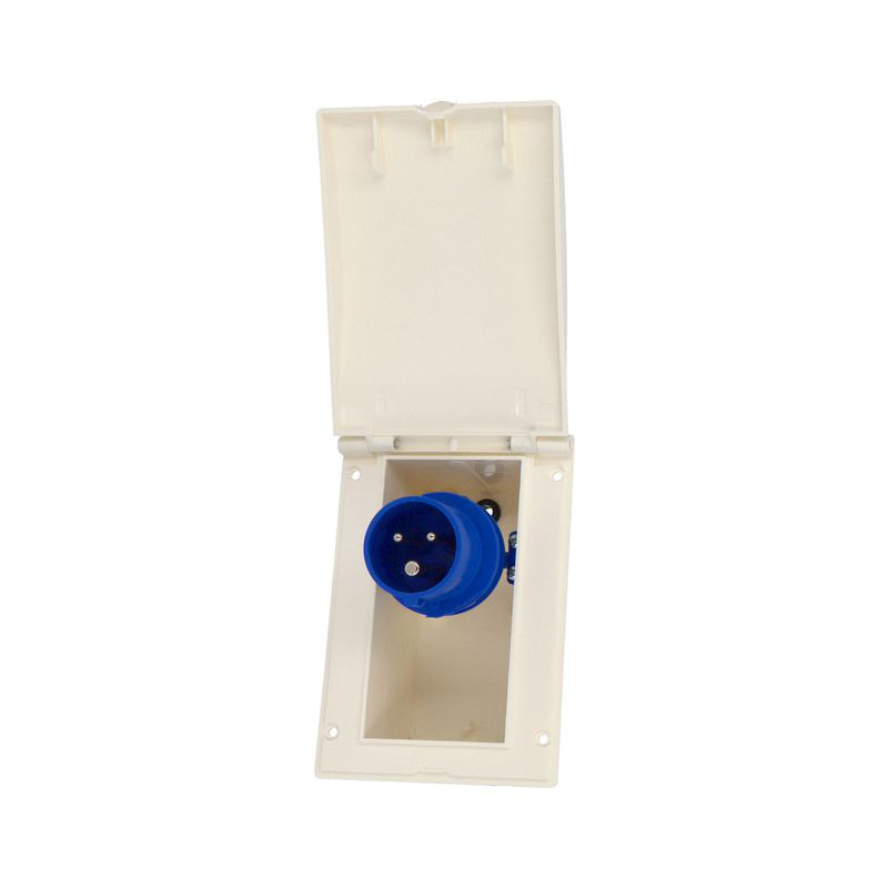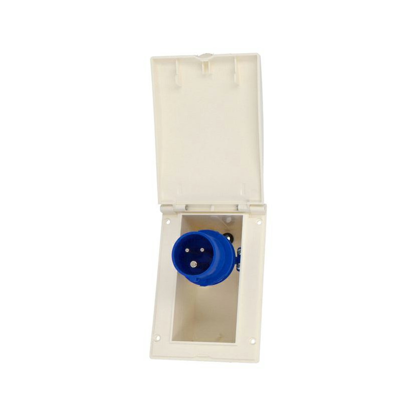 Výklopná zapuštěná vidlice Famatel 13361 IP44/230V/16A/3P, pro napájení karavanů, šikmá bílá. Rozměry 159x110x127 mm.