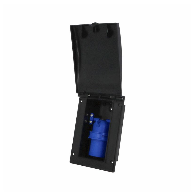 Výklopná zapuštěná vidlice Famatel 13362 IP44/230V/16A/3P, pro napájení karavanů, šikmá černá. Rozměry 159x110x127 mm.